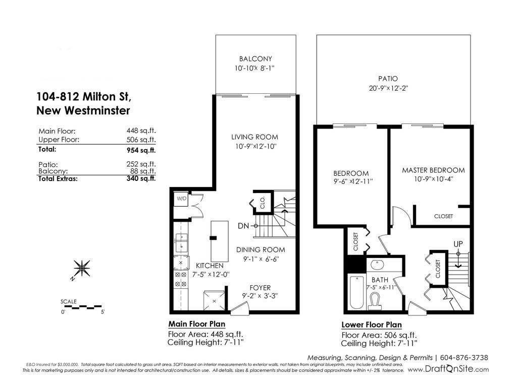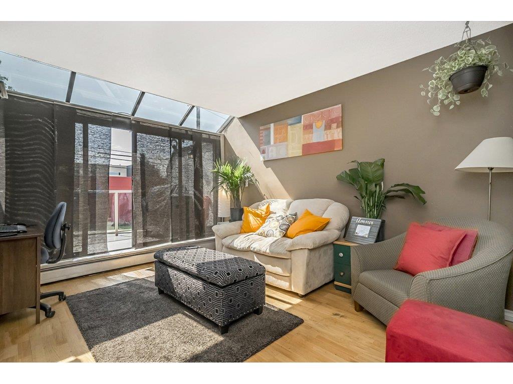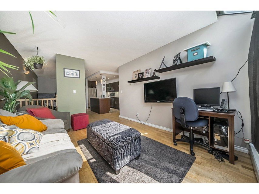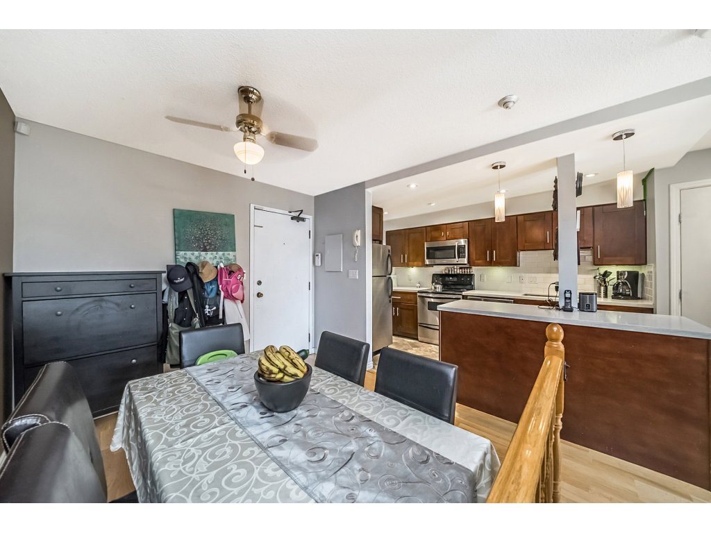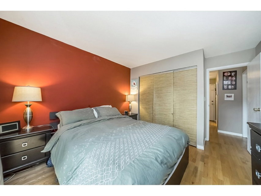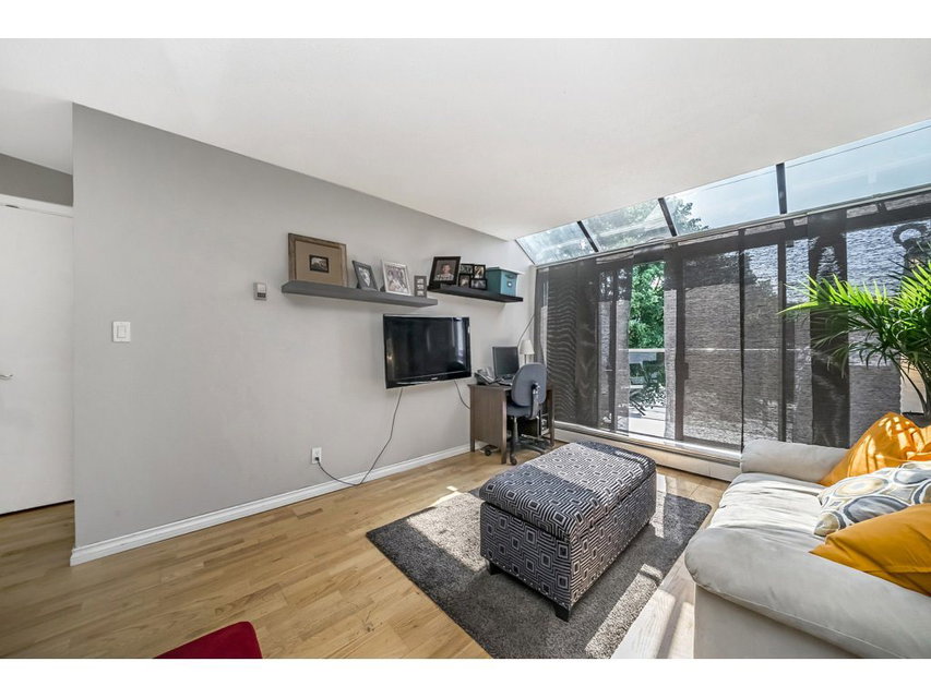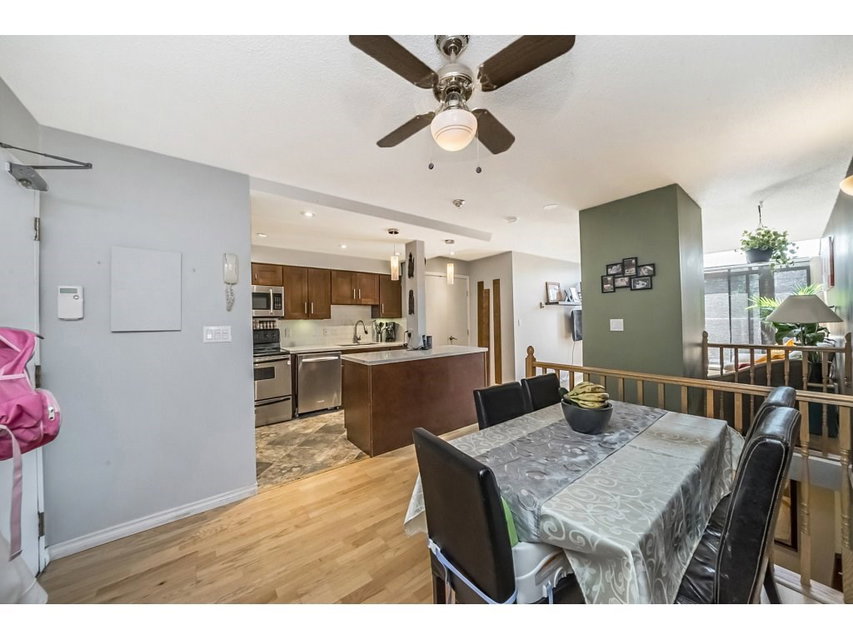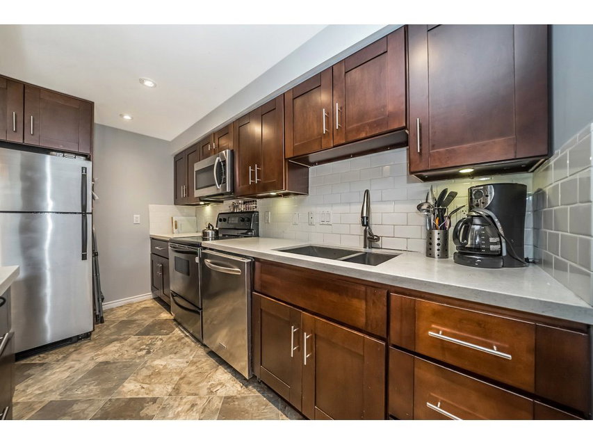 More like a townhome than a condo, featuring living room, dining room & updated kitchen on main. Downstairs has two large bedrooms & four piece bathroom. Kitchen has been updated with new cabinetry, quartz counters, pendant lighting over island & stainless steel appliances. Real hardwood flooring on main floor. Insuite laundry conveniently located on main floor. Lovely south east facing deck off living room. Huge fenced 250 sq ft private patio off both bedrooms. Updates to building include new elevator, new piping in hallways, new decks, new exterior & interior paint. Roof done in 2010. 2 PETS. 100% RENTALS ALLOWED. One parking, one locker. State of the art middle school across the street. Easy access to skytrain, transit & shopping.