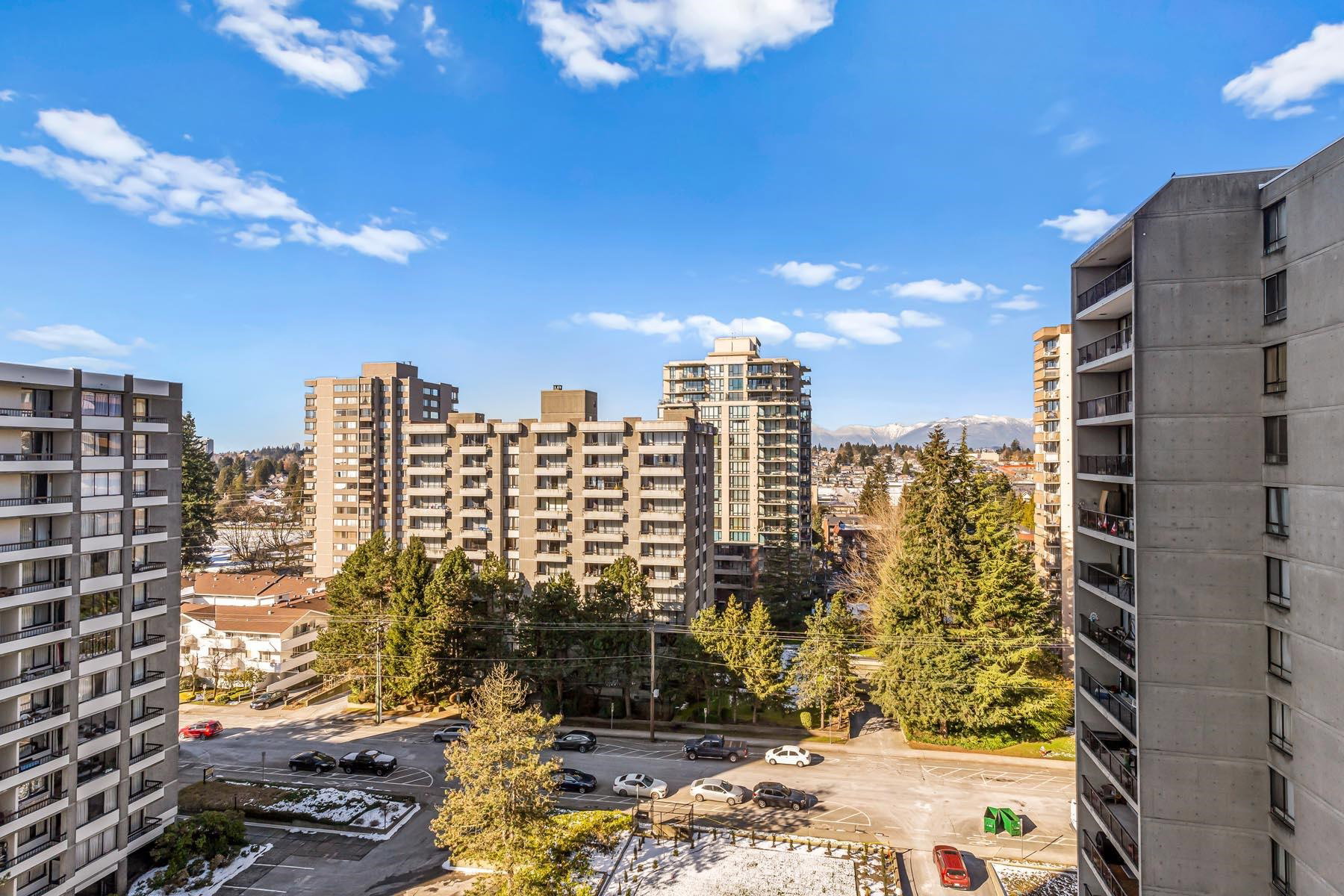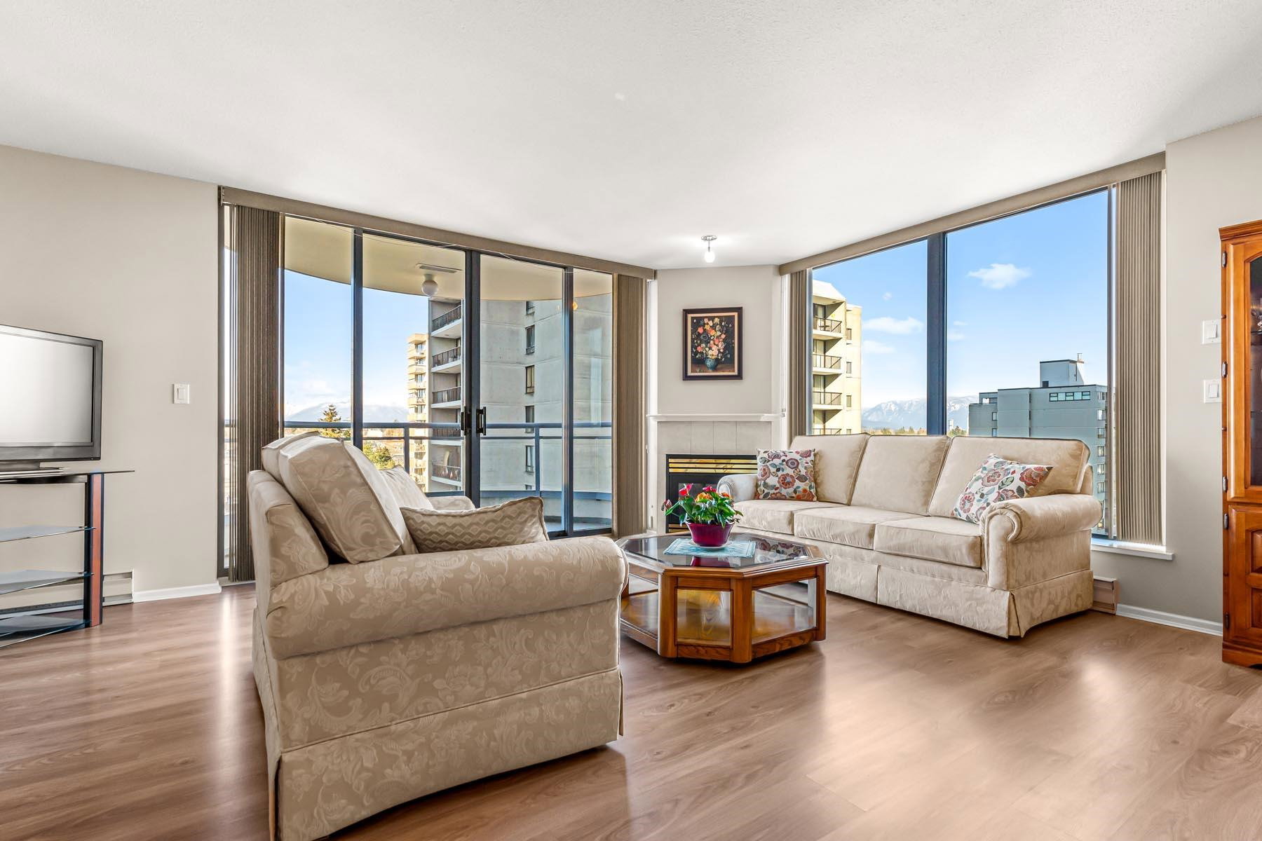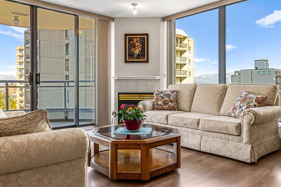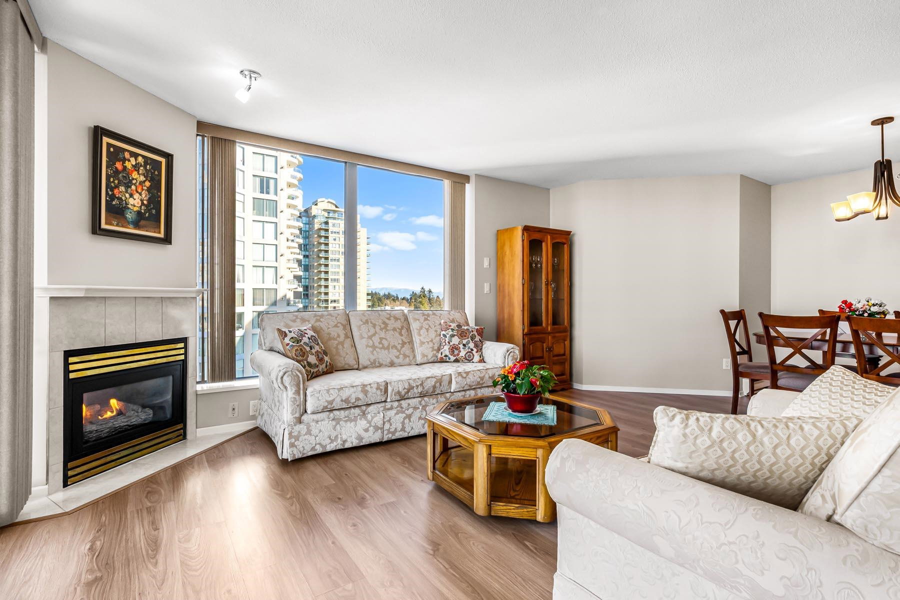 2 bed + 2 bath + 2 balconies, this bright clean corner unit is in immaculate condition! Huge living room has gas fireplace & access to one of the balconies. Nice open kitchen w/ updated appliances & breakfast bar. Such a great layout & updated floors throughout. Both bedrooms have access to second balcony. Full ensuite bathroom off the main bedroom. Large laundry room adds valuable storage space. Incredible mountain & city views! Berkley place is a solid building built by Bosa – updated elevators, pipes, lobby/hallways. Gym, tennis court, workshop, caretaker, social room, visitor parking. 1 extra wide parking stall & storage locker. 1 dog/cat allowed (any size). Walk to all Uptown Amenities – 97 walk score.