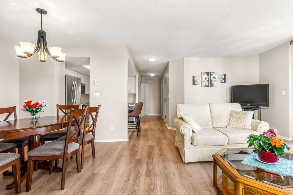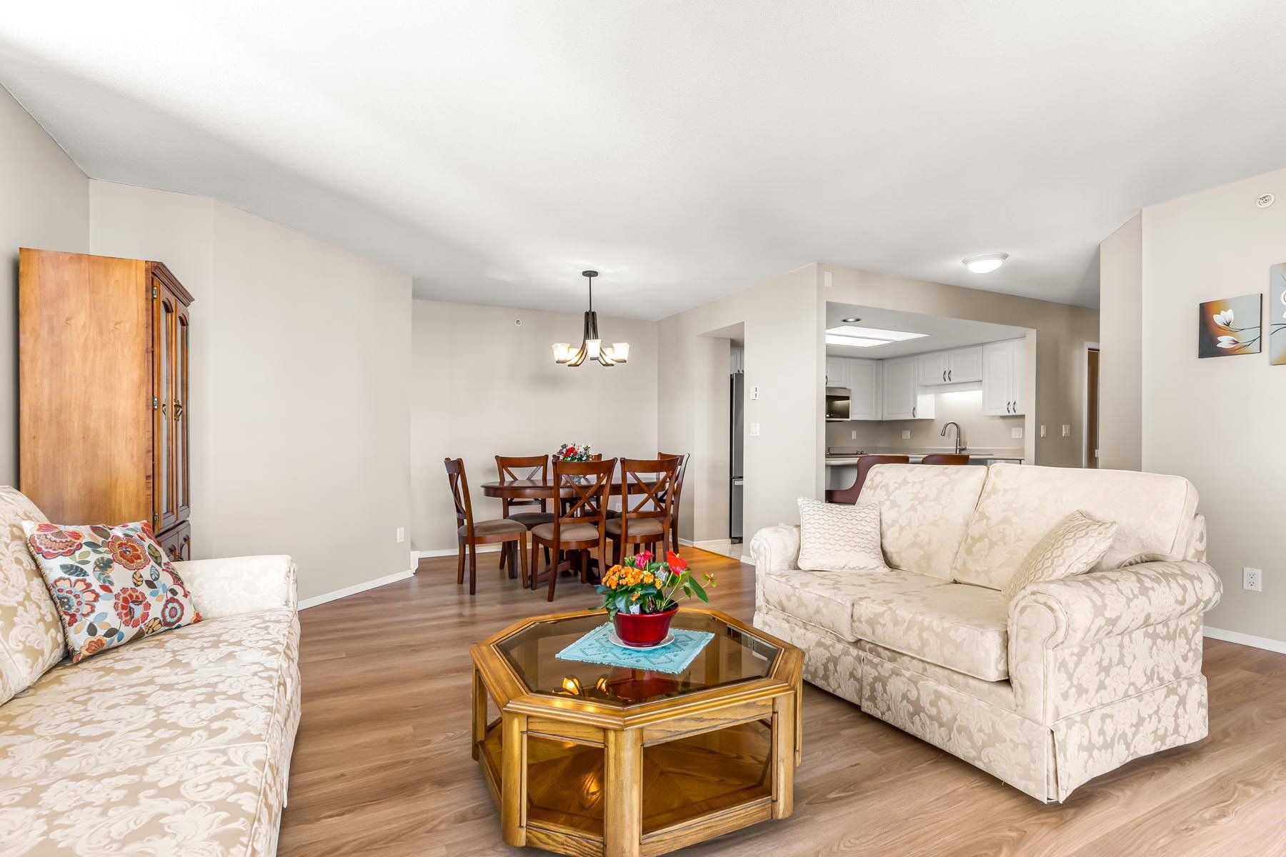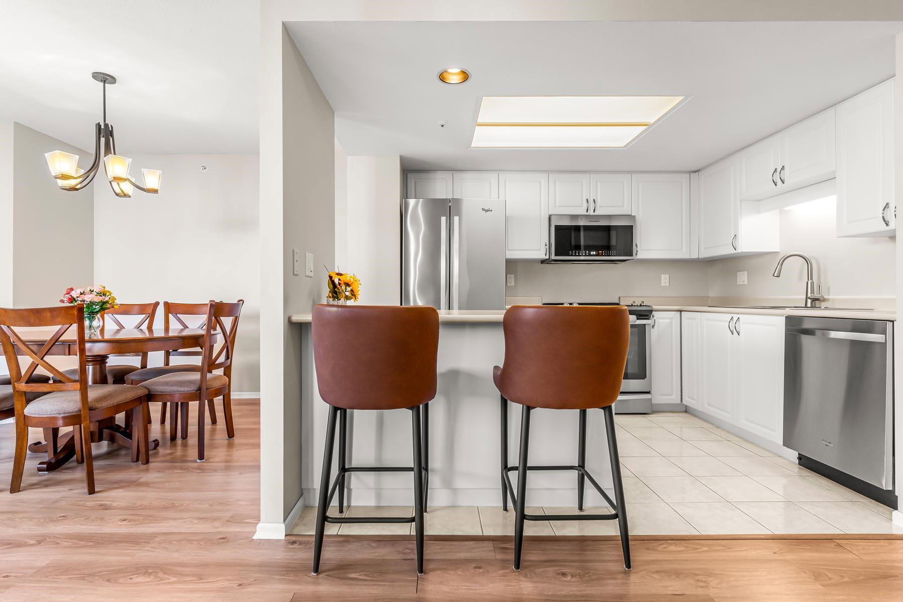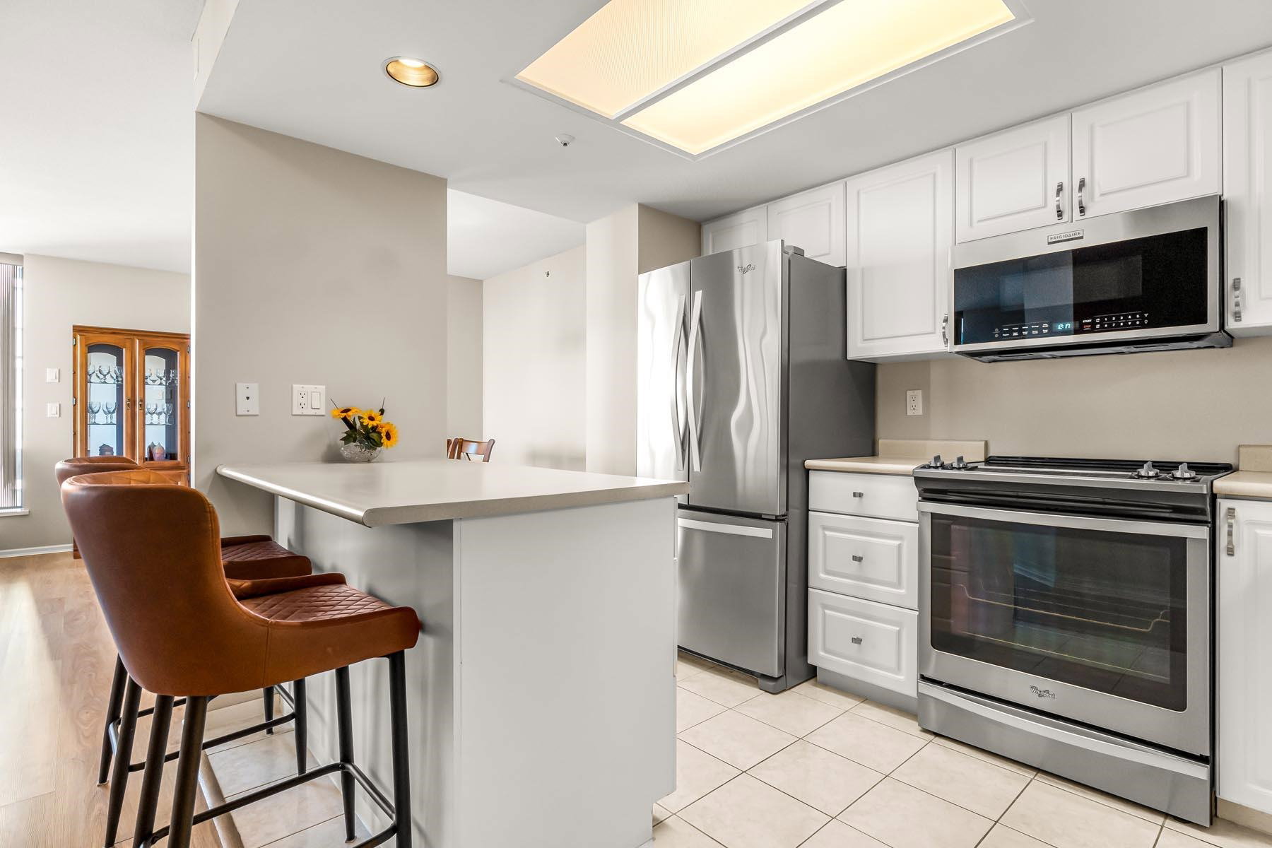 2 bed + 2 bath + 2 balconies, this bright clean corner unit is in immaculate condition! Huge living room has gas fireplace & access to one of the balconies. Nice open kitchen w/ updated appliances & breakfast bar. Such a great layout & updated floors throughout. Both bedrooms have access to second balcony. Full ensuite bathroom off the main bedroom. Large laundry room adds valuable storage space. Incredible mountain & city views! Berkley place is a solid building built by Bosa – updated elevators, pipes, lobby/hallways. Gym, tennis court, workshop, caretaker, social room, visitor parking. 1 extra wide parking stall & storage locker. 1 dog/cat allowed (any size). Walk to all Uptown Amenities – 97 walk score.
