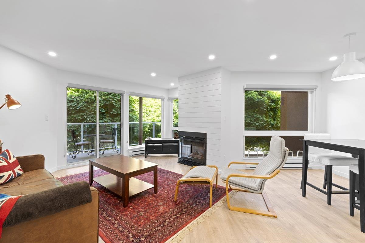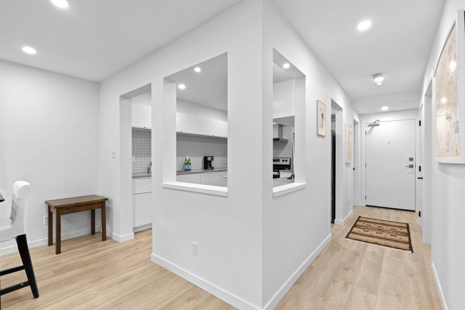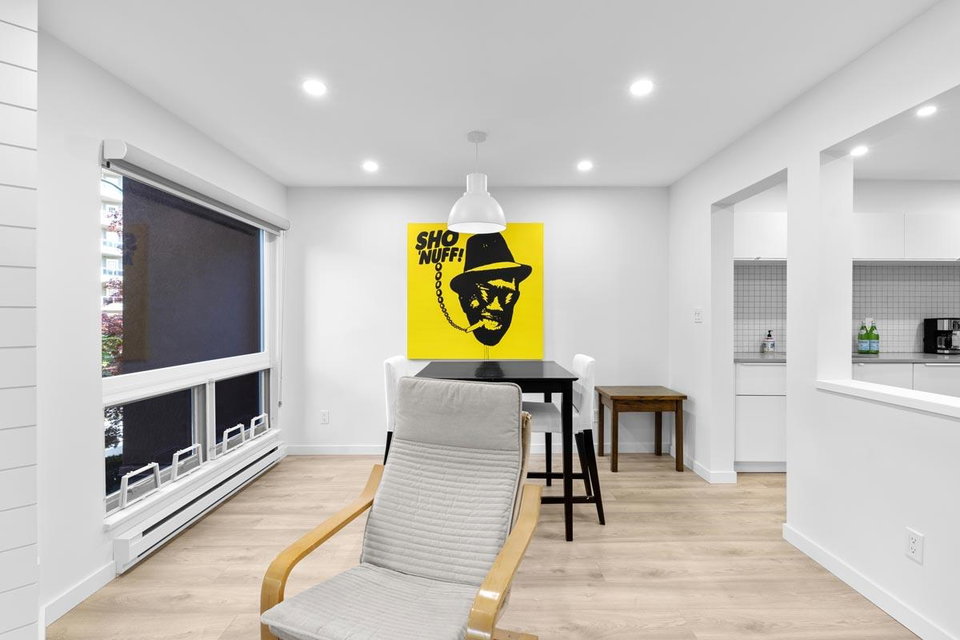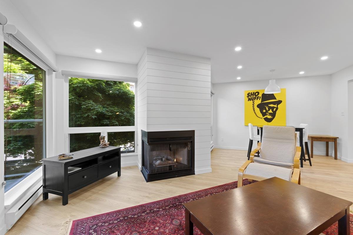 Your new home awaits! This one needs to be seen to be fully appreciated. Everything has been done for the new owner. Stylish laminate flooring throughout. Gorgeous sleek white kitchen with new stainless steel appliances. Spa like four piece bath with under vanity lighting. One of the best features is the “real” laundry room, with new side by side washer and dryer. Gas fireplace in living room. With over 950 square feet this one bedroom offers plenty of room. There is a locker on the same floor and one parking. Just steps to the Boardwalk, shopping, transit, Skytrain and entertainment. Two pets allowed, weighing up to 22 lbs.