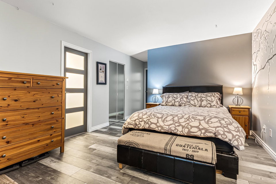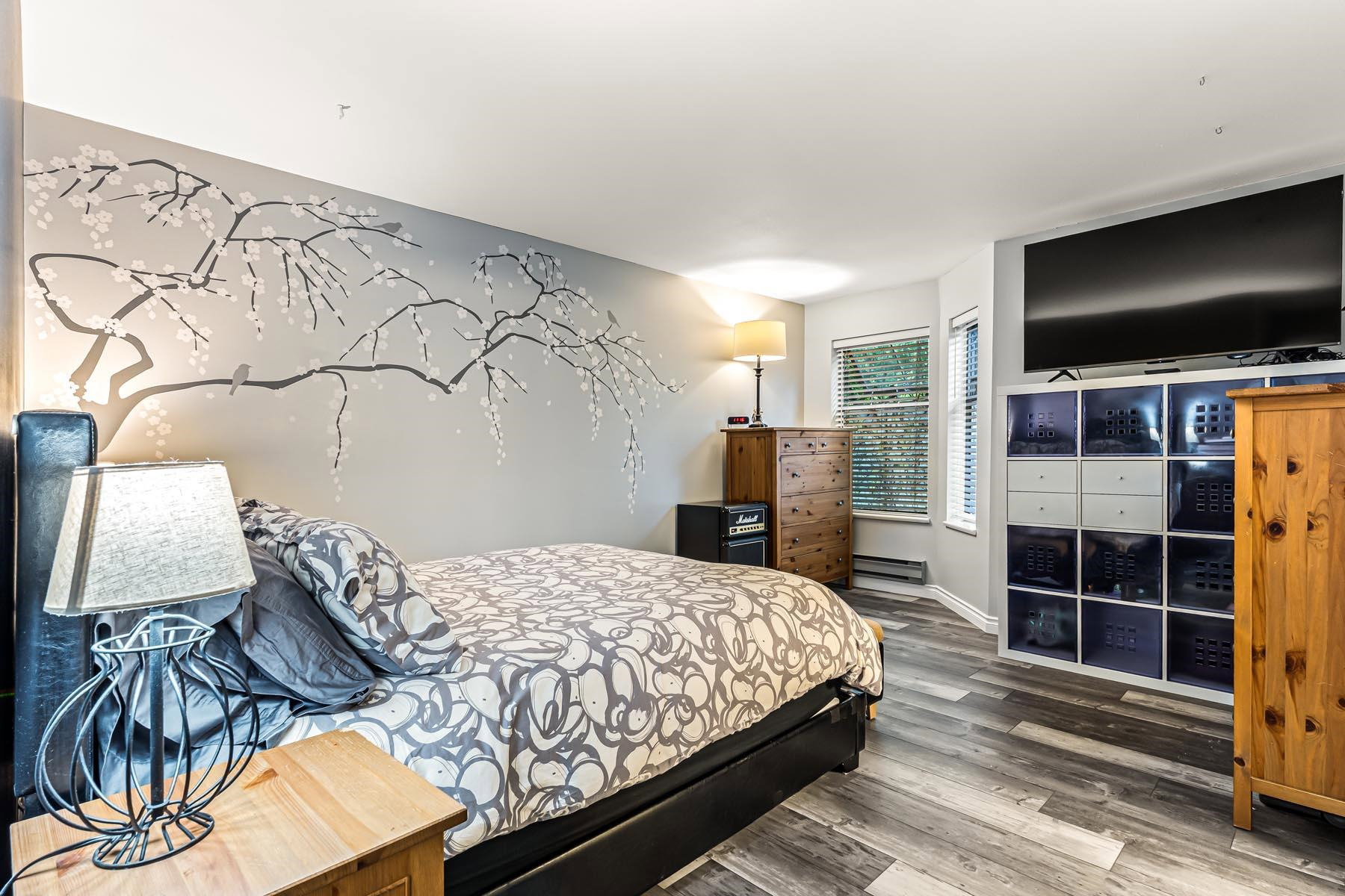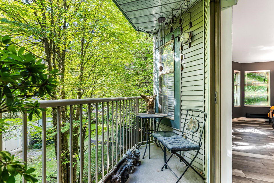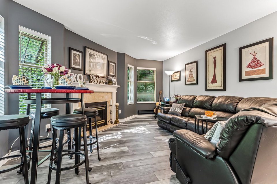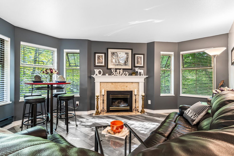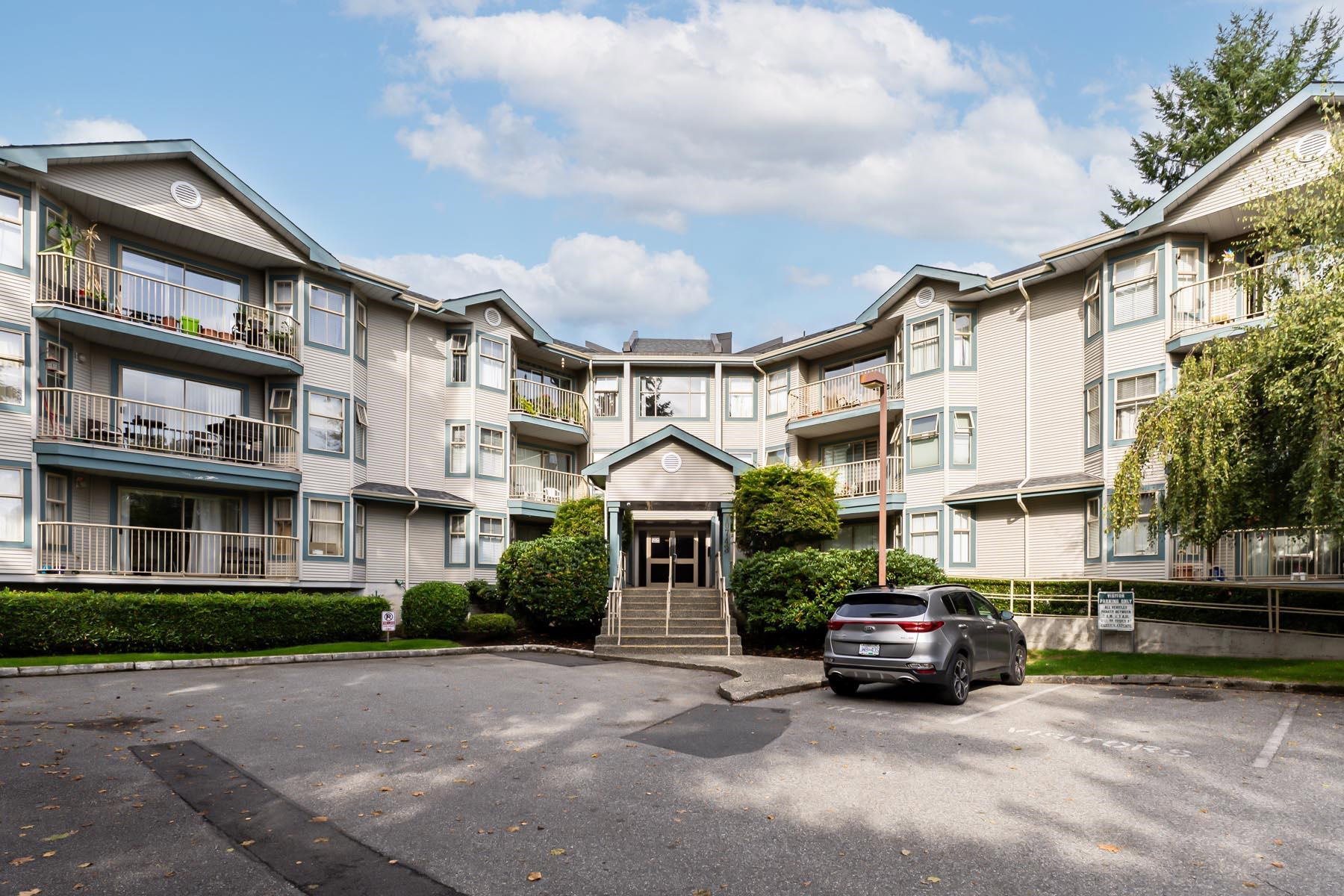 Nicely renovated 2 bed, 2 bath, 1120 sq ft corner unit. A desirable unit in the building surrounded by trees – tranquil private setting. Spacious rooms & updated vinyl floors throughout. Primary bedroom includes walk-in closet & full ensuite bathroom. Updated kitchen w/ breakfast bar and open to the dining & living rooms. Not all units in the building have a gas fireplace but this one does! Gas is included in the strata fee. Separate laundry room is great for storage. Hot water tank replaced in Feb 2023. 1 parking stall & visitor parking. Storage locker is conveniently located on the same floor as the unit. 1 small dog or cat allowed. Proactive strata, well maintained buildings, healthy CRF. Across from Forsyth Rd Elementary, close to Forsyth Park/dog park, skytrain, Central City & more!