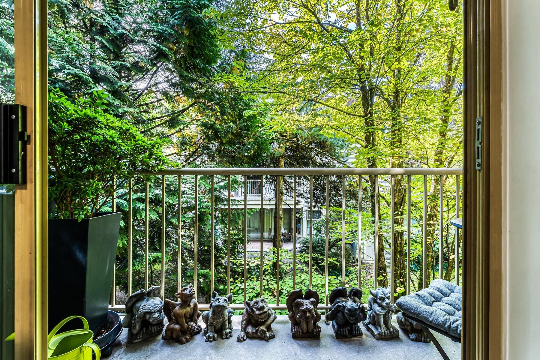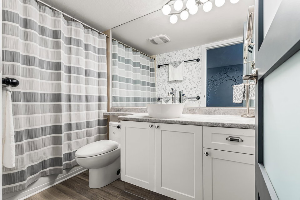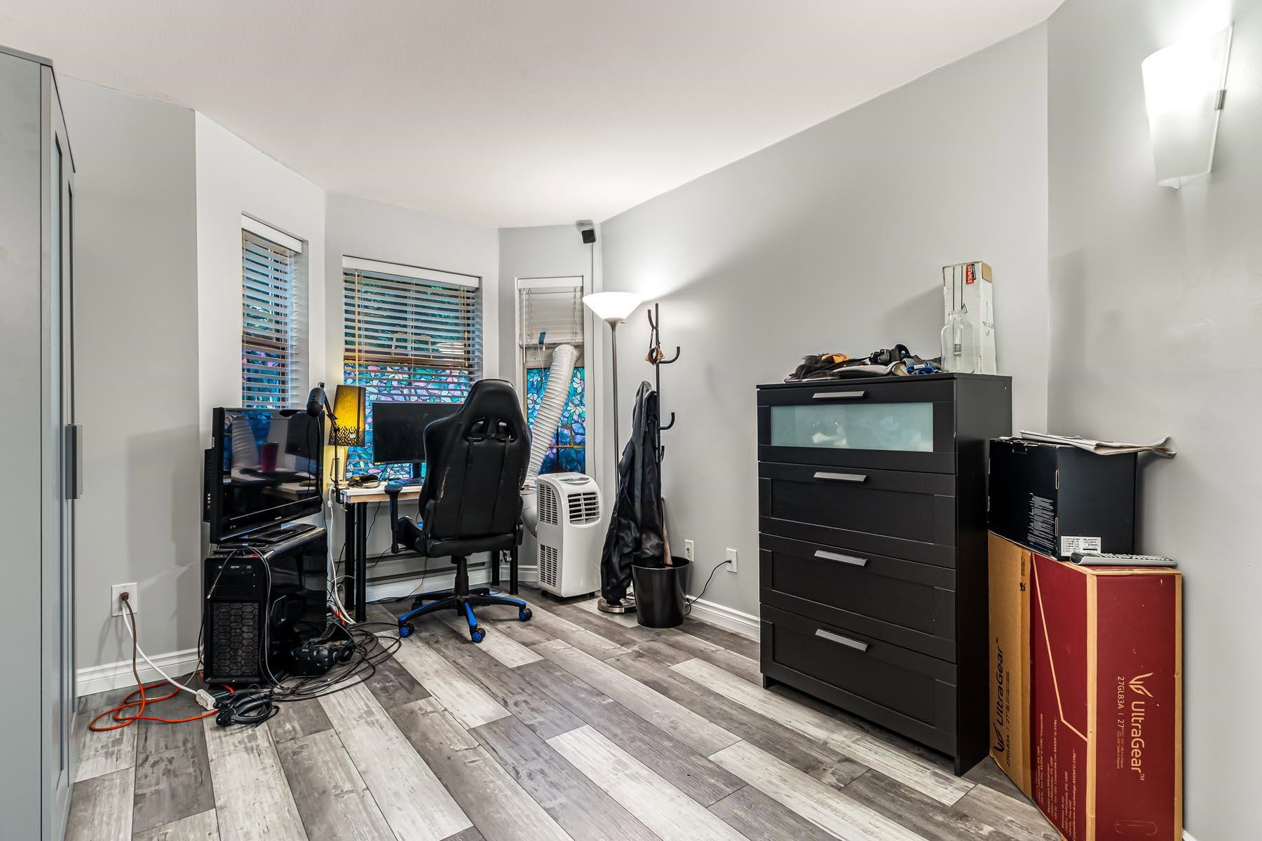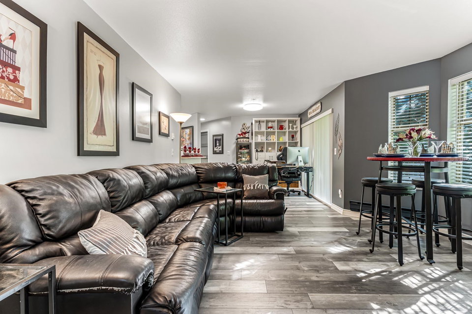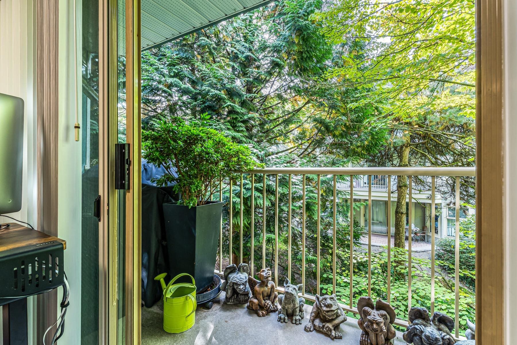 Nicely renovated 2 bed, 2 bath, 1120 sq ft corner unit. A desirable unit in the building surrounded by trees – tranquil private setting. Spacious rooms & updated vinyl floors throughout. Primary bedroom includes walk-in closet & full ensuite bathroom. Updated kitchen w/ breakfast bar and open to the dining & living rooms. Not all units in the building have a gas fireplace but this one does! Gas is included in the strata fee. Separate laundry room is great for storage. Hot water tank replaced in Feb 2023. 1 parking stall & visitor parking. Storage locker is conveniently located on the same floor as the unit. 1 small dog or cat allowed. Proactive strata, well maintained buildings, healthy CRF. Across from Forsyth Rd Elementary, close to Forsyth Park/dog park, skytrain, Central City & more!