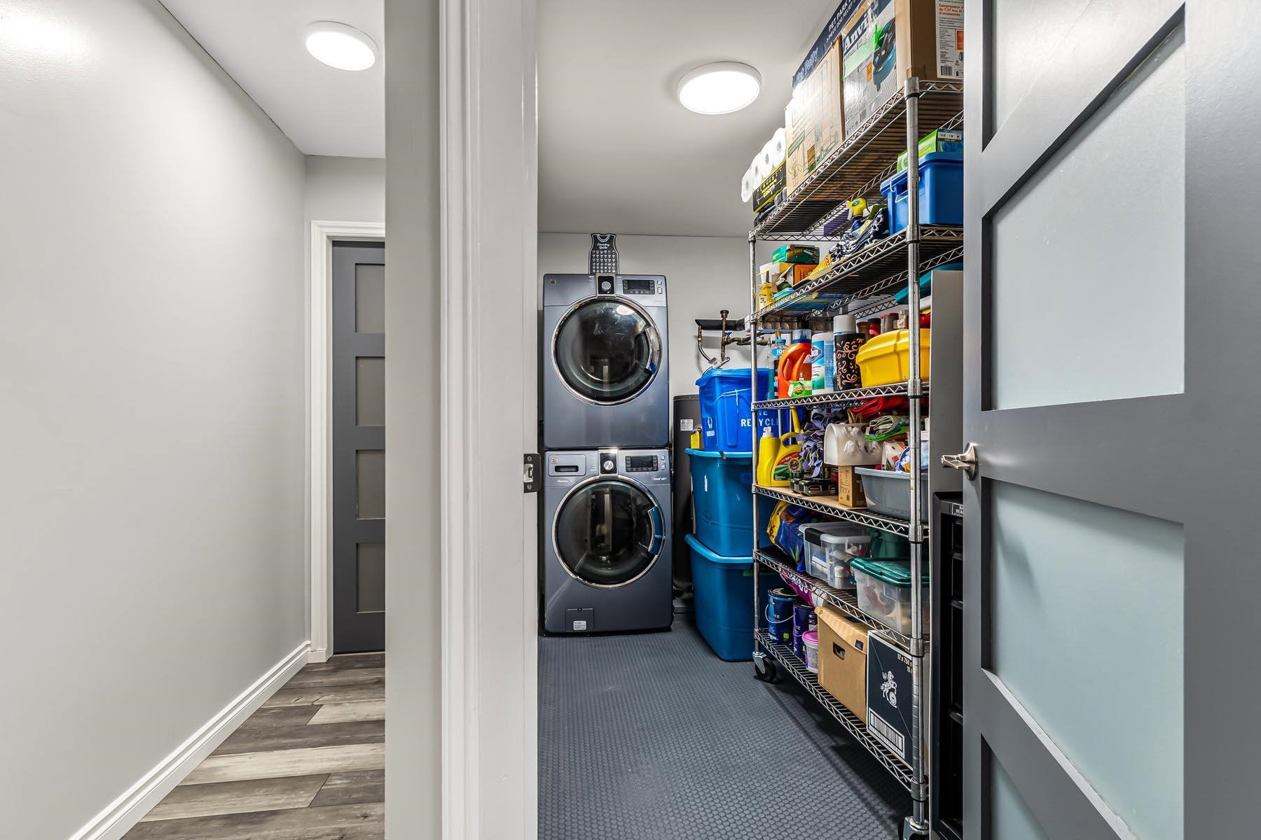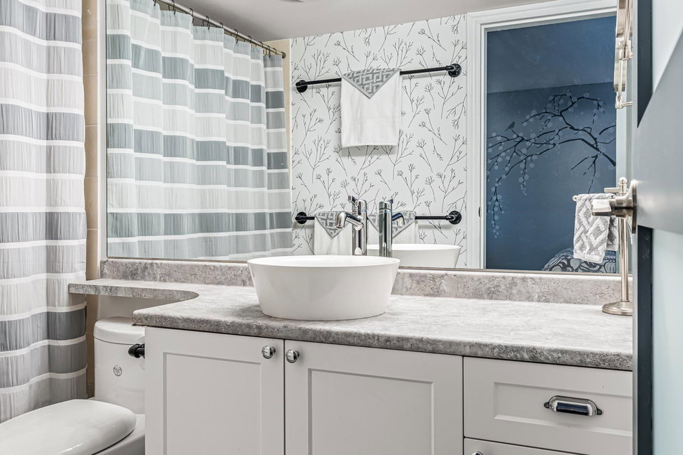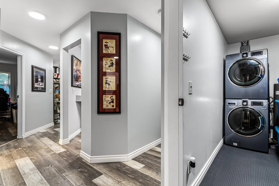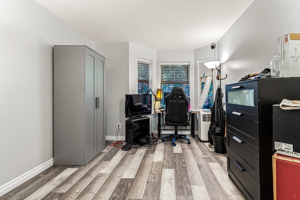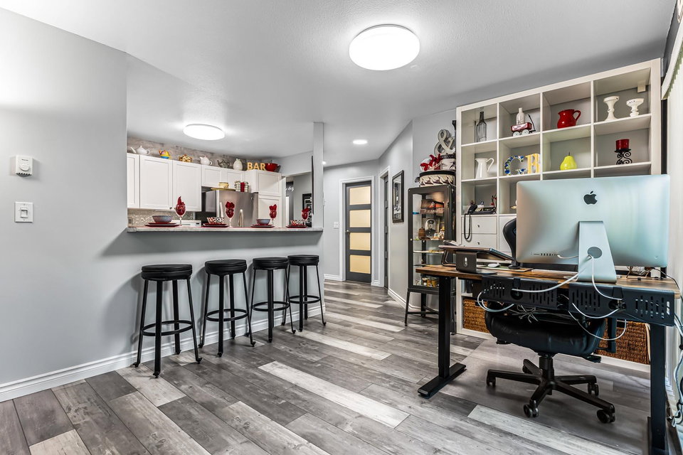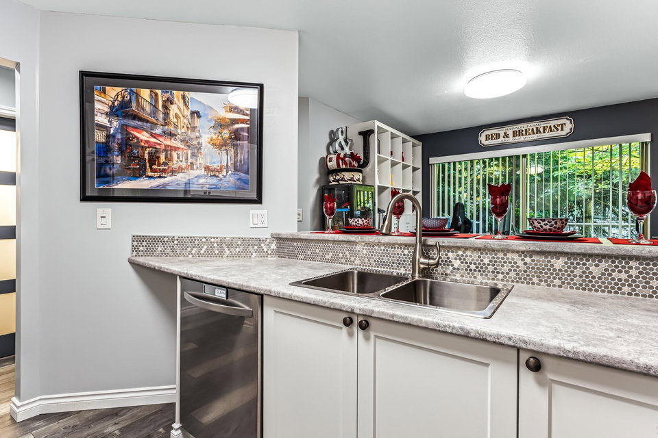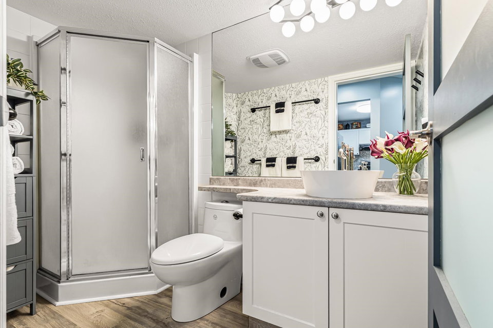 Nicely renovated 2 bed, 2 bath, 1120 sq ft corner unit. A desirable unit in the building surrounded by trees – tranquil private setting. Spacious rooms & updated vinyl floors throughout. Primary bedroom includes walk-in closet & full ensuite bathroom. Updated kitchen w/ breakfast bar and open to the dining & living rooms. Not all units in the building have a gas fireplace but this one does! Gas is included in the strata fee. Separate laundry room is great for storage. Hot water tank replaced in Feb 2023. 1 parking stall & visitor parking. Storage locker is conveniently located on the same floor as the unit. 1 small dog or cat allowed. Proactive strata, well maintained buildings, healthy CRF. Across from Forsyth Rd Elementary, close to Forsyth Park/dog park, skytrain, Central City & more!
