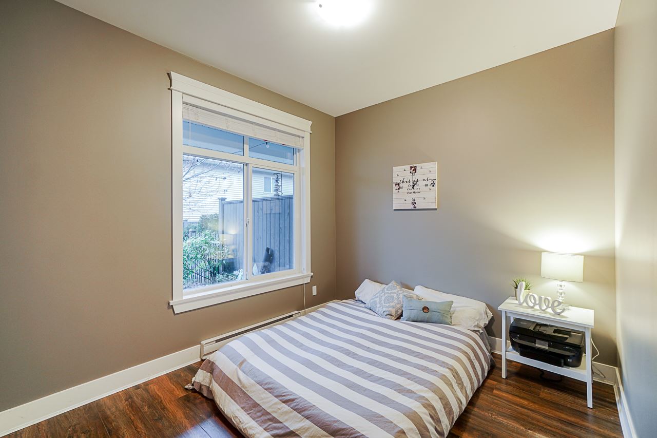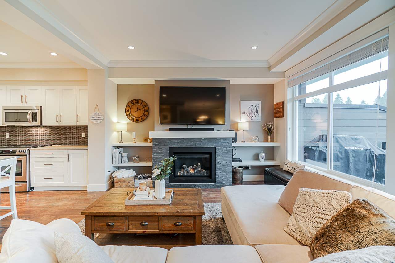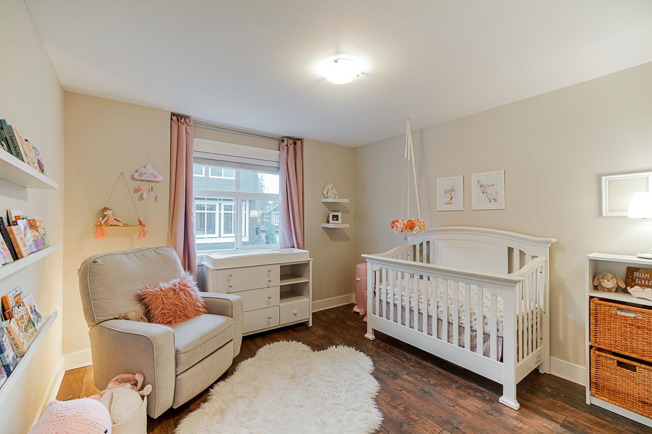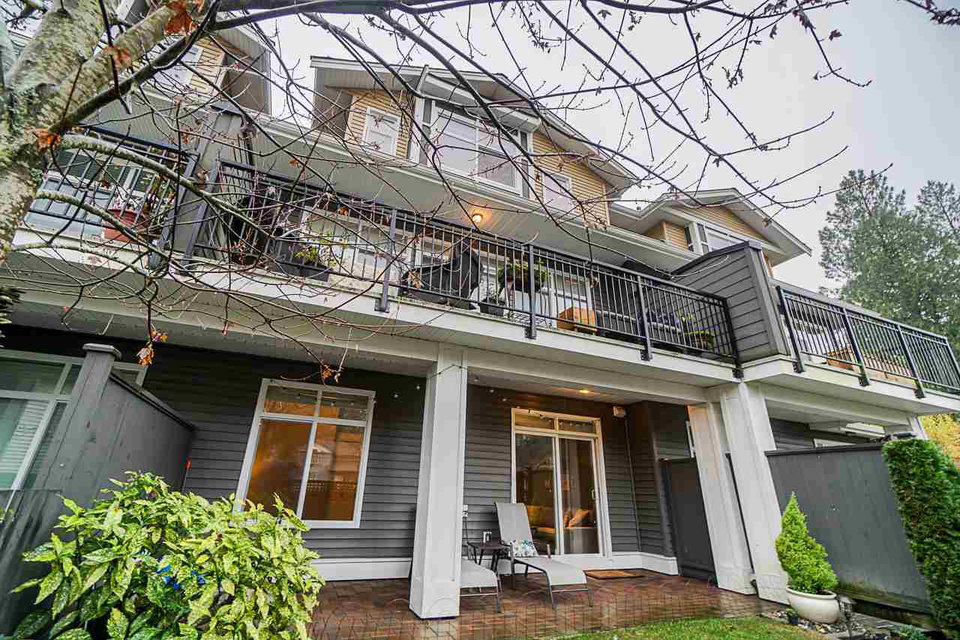 Sought after Two Birds executive townhome built by Wallmark Custom Homes. With over 2200 square feet, this wonderful family home offers four bedrooms and four baths. Walk out basement to fenced rear yard. Kitchen features include white custom cabinetry, Kitchenaid stainless steel appliances, gas stove, quartz counters and island with breakfast bar. Wall to wall windows in living and dining area, so plenty of light. Gas fireplace in living room. Three spacious bedrooms up; master has a five piece ensuite and walk-in closet. Down features a family room with custom built bar, plus a bath and fourth bedroom. High end laminate flooring throughout. Spacious deck off living and dining areas. Double side by side garage. Plenty of visitor parking.