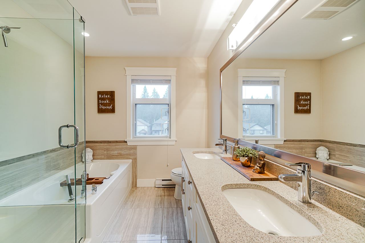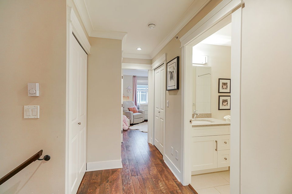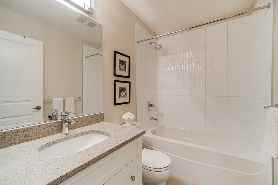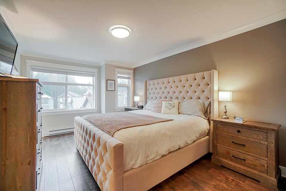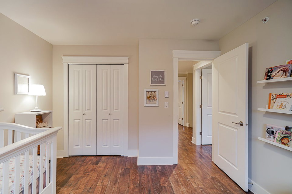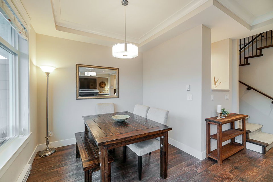 Sought after Two Birds executive townhome built by Wallmark Custom Homes. With over 2200 square feet, this wonderful family home offers four bedrooms and four baths. Walk out basement to fenced rear yard. Kitchen features include white custom cabinetry, Kitchenaid stainless steel appliances, gas stove, quartz counters and island with breakfast bar. Wall to wall windows in living and dining area, so plenty of light. Gas fireplace in living room. Three spacious bedrooms up; master has a five piece ensuite and walk-in closet. Down features a family room with custom built bar, plus a bath and fourth bedroom. High end laminate flooring throughout. Spacious deck off living and dining areas. Double side by side garage. Plenty of visitor parking.