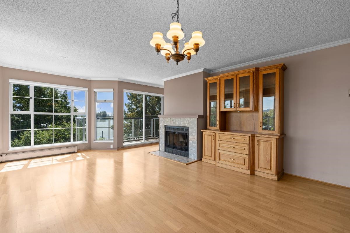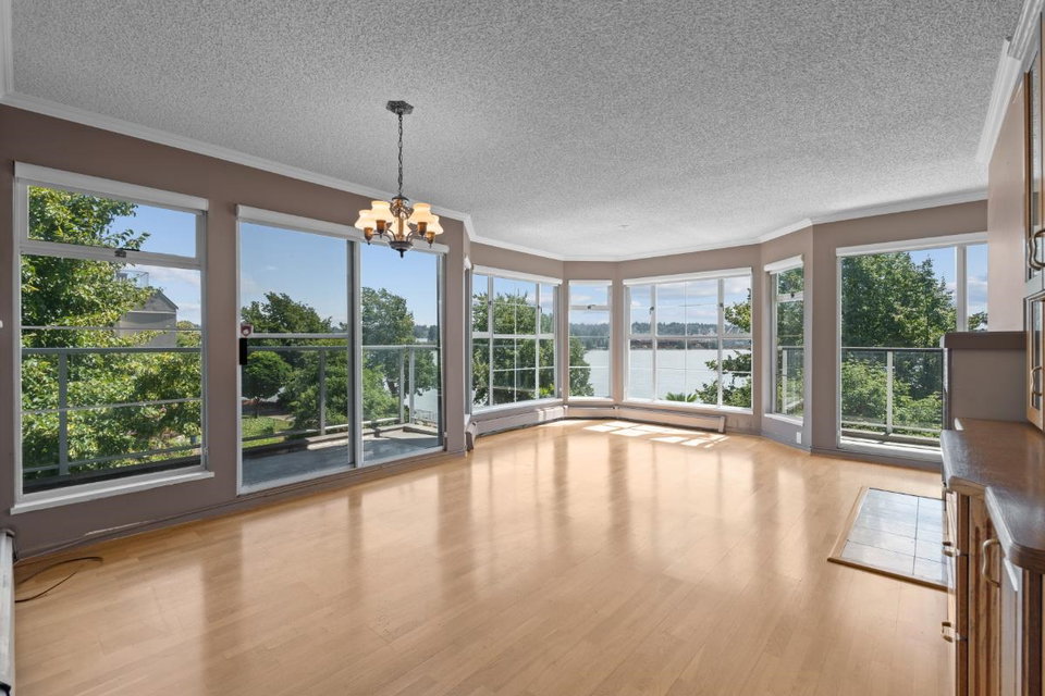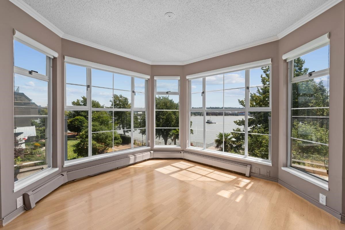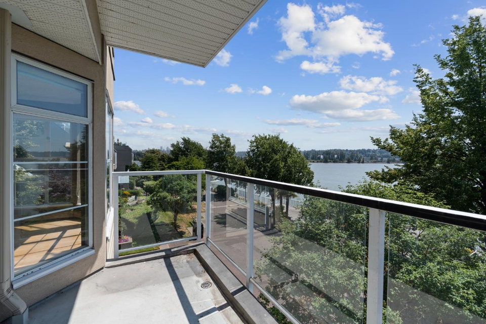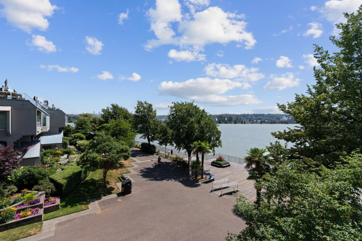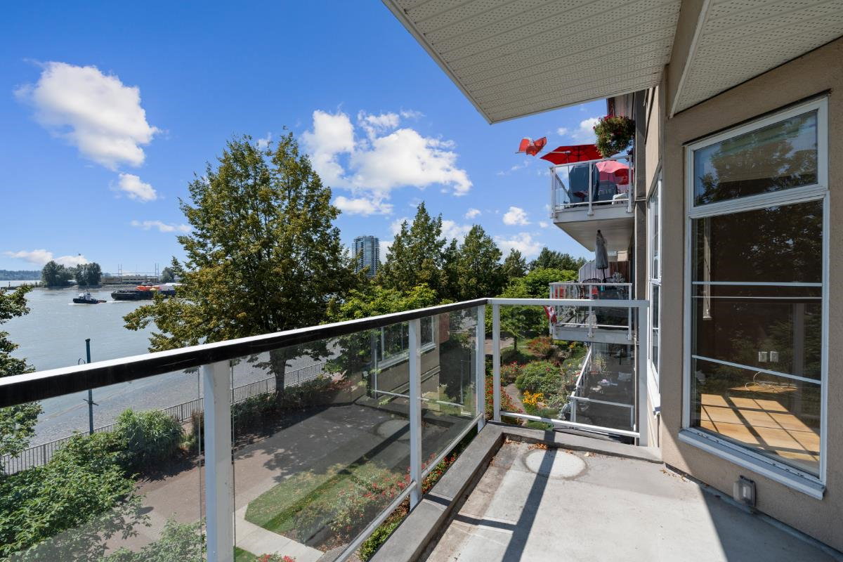 This spacious riverfront 2 bedroom and den corner unit at The Quay offers beautiful river and boardwalk views. 1,300 sq ft of bright living space with an abundance of south-facing windows. 2 balconies to relax and take in the views. Large kitchen with loads of countertop & cabinet space. Spacious rooms throughout. Gas fireplace in living room, included in strata fee. 2 pets allowed. 1 parking stall and visitor parking. Common room with fitness equipment, pool table and sauna. Just steps to cafes, restaurants, shops, River Market, Pier Park, Skytrain & downtown New West. OPEN HOUSE SATURDAY SEPT. 27, 3-4:30 PM.