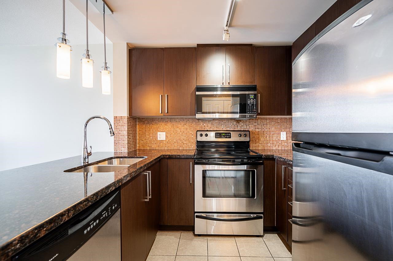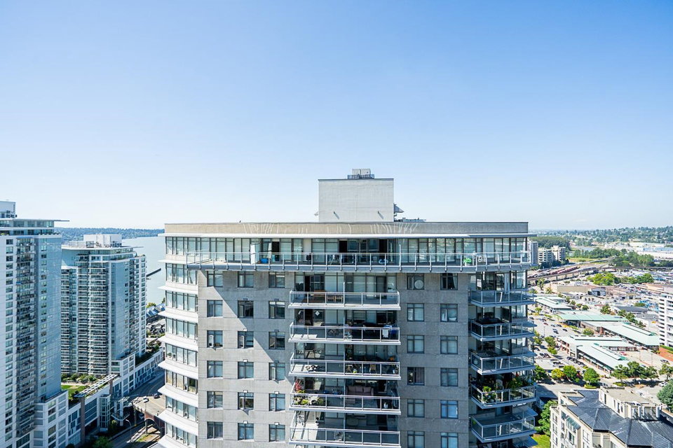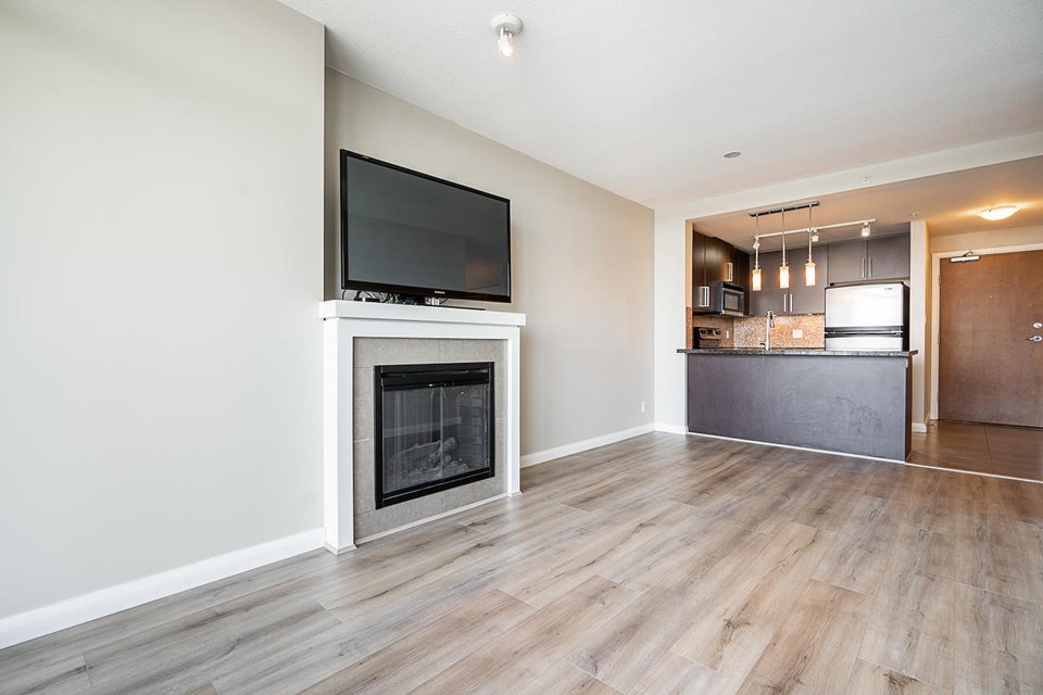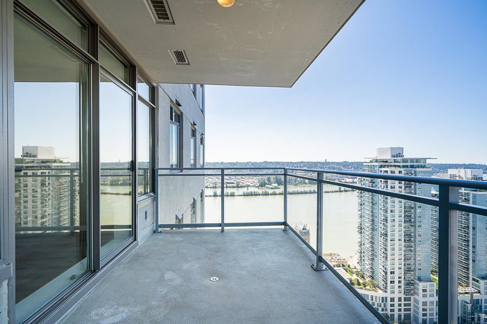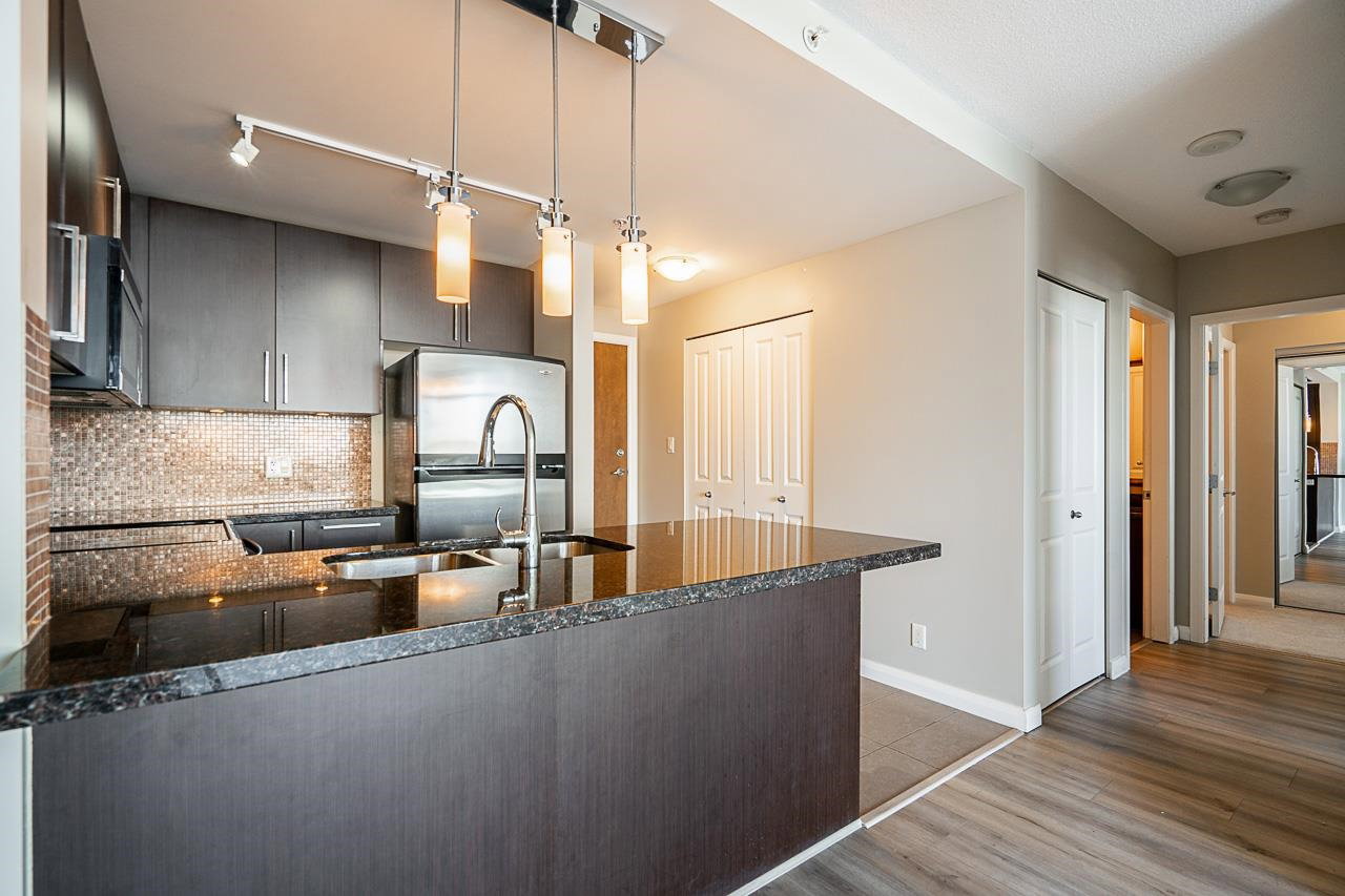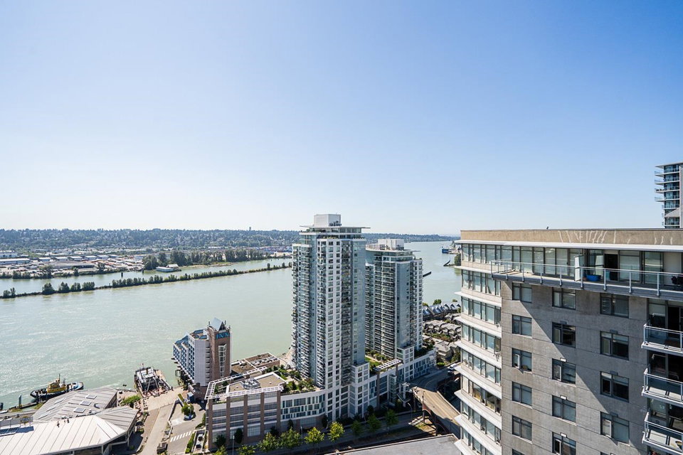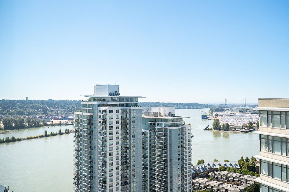 Love the high life, then you will appreciate this suite. This well cared for home features two bedrooms and two full bathrooms. New carpets in both bedrooms. Primary bedroom has a four piece ensuite. Quality, new laminate flooring throughout main living space. Kitchen has lots of cupboards, granite counters and stainless steel appliances. Electric fireplace in living room. Insuite laundry. Beautiful large deck off of living room offering spectacular river and city views. Steps to Sky Train, transit, shopping, Market and entertainment area. One pet allowed. 1 parking stall and one locker.