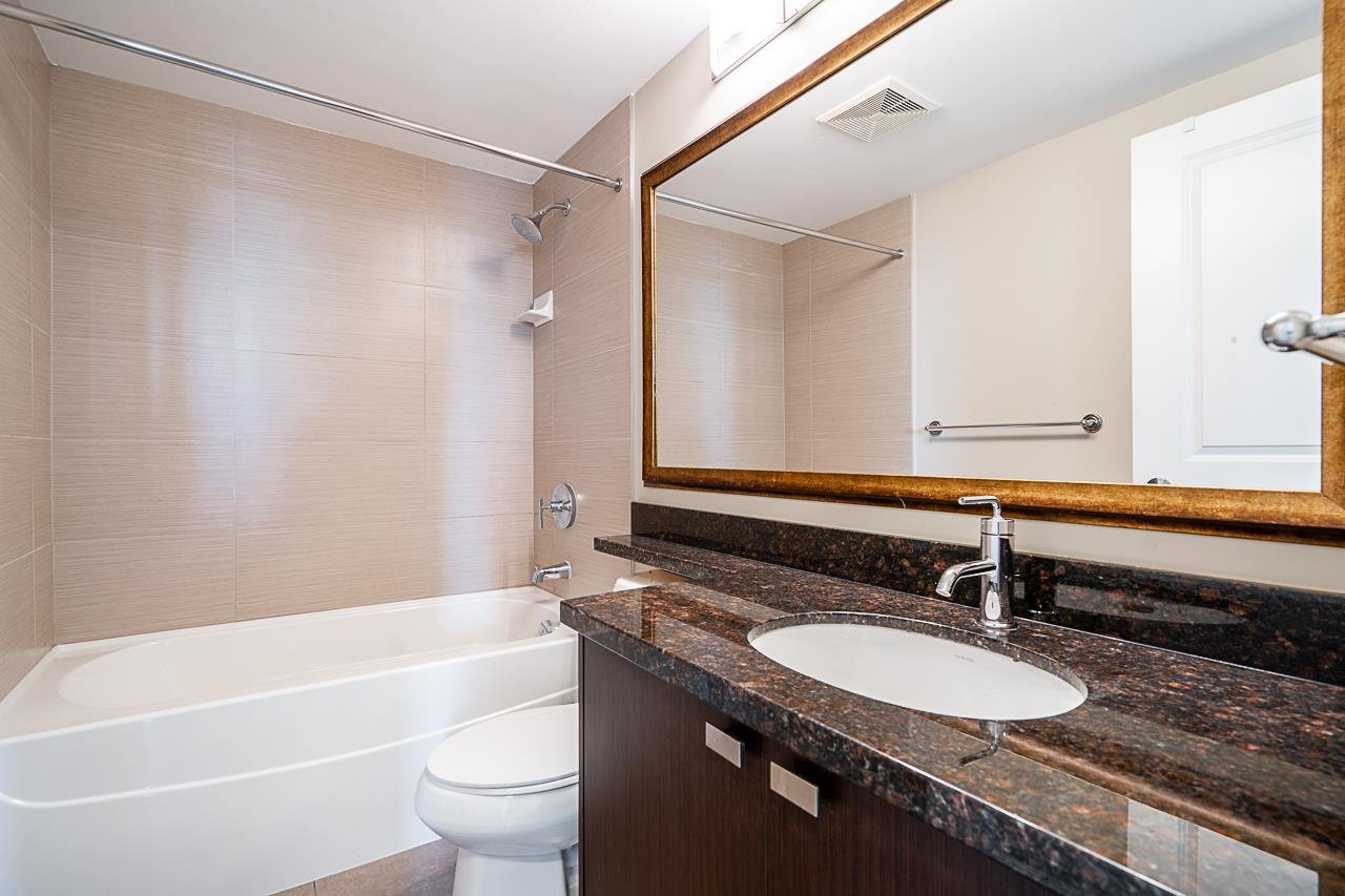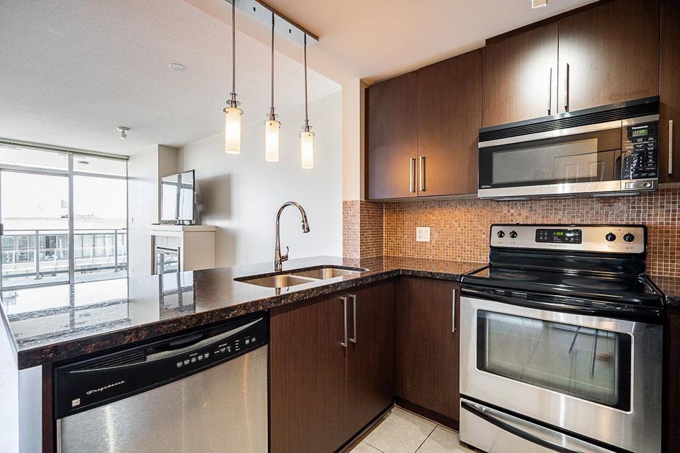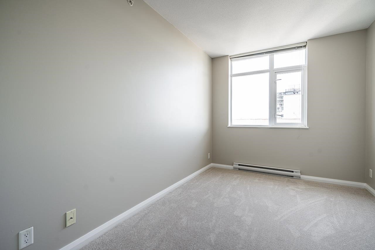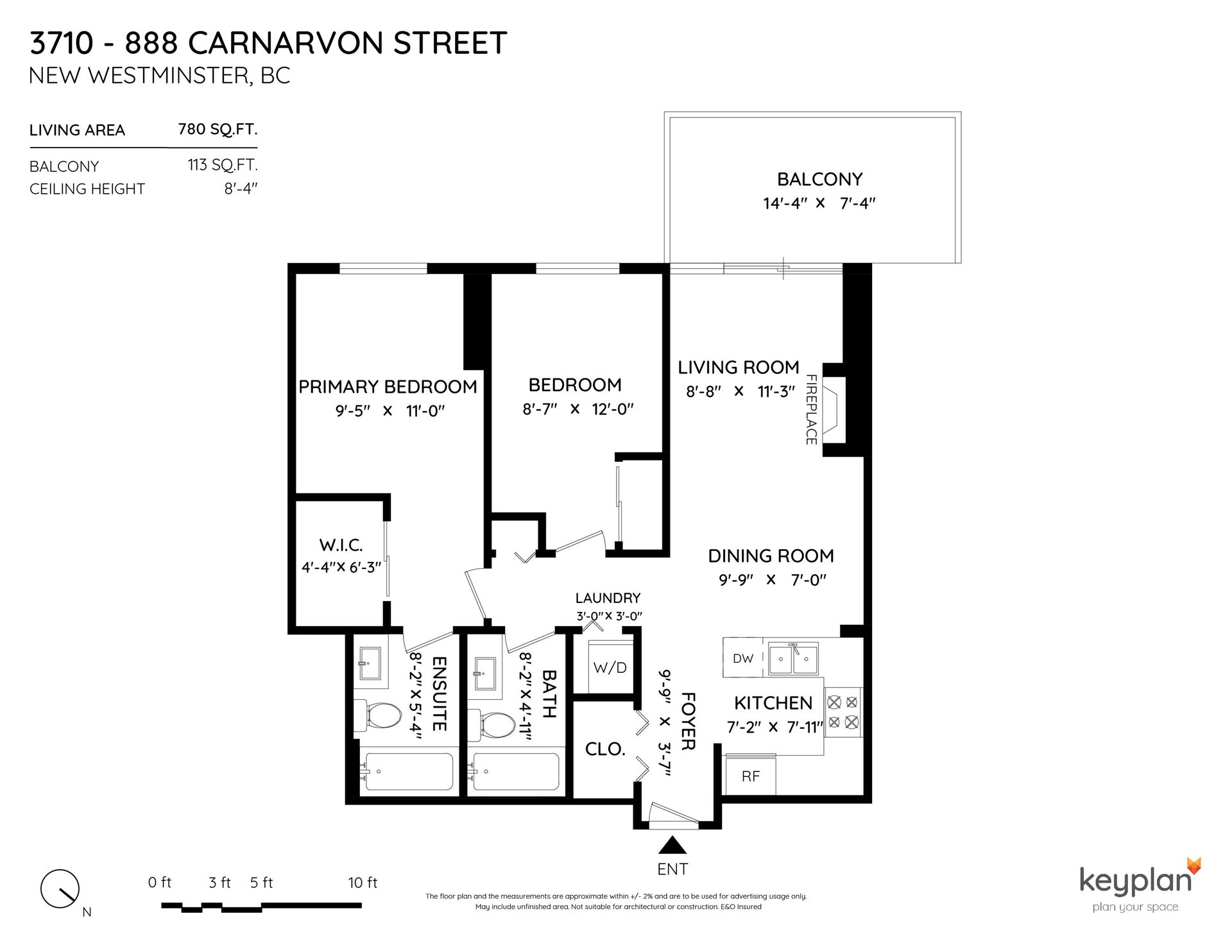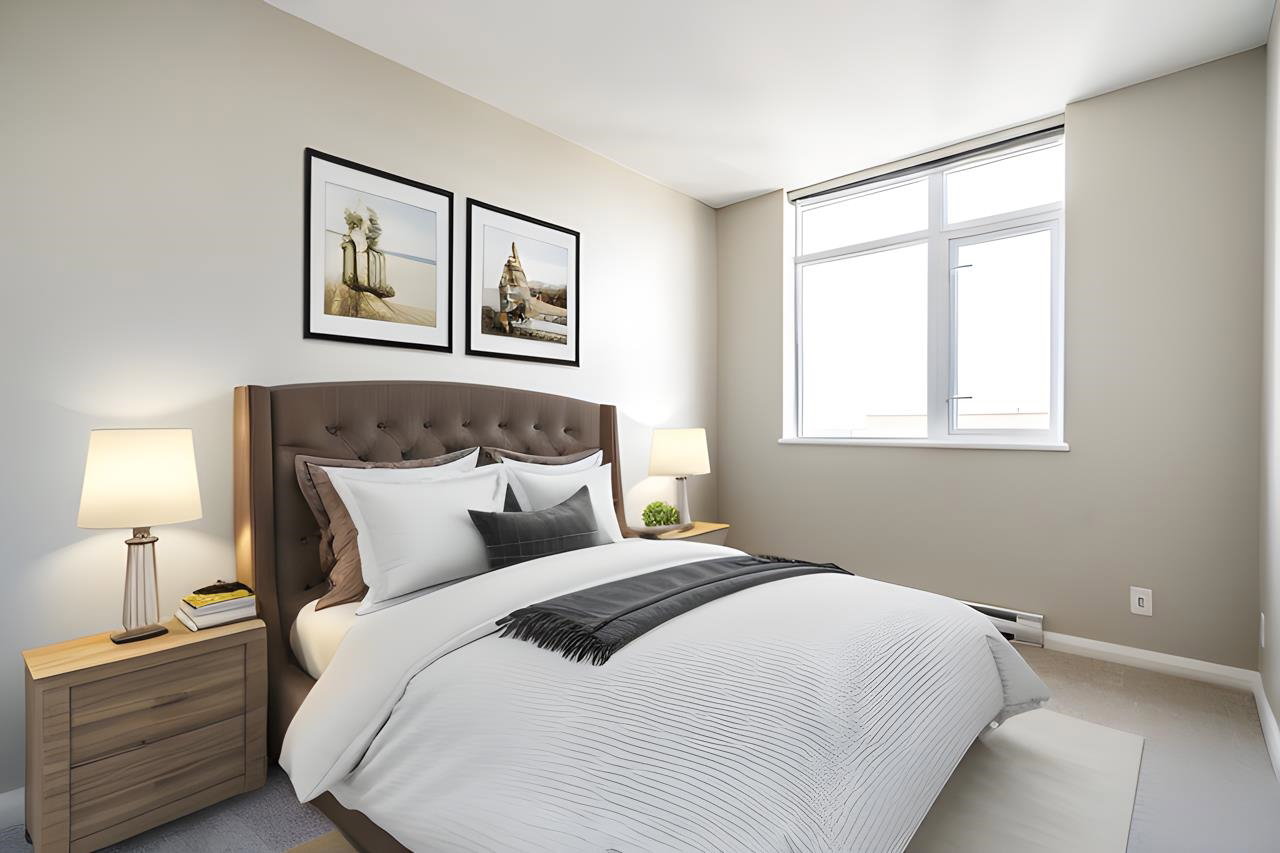 Love the high life, then you will appreciate this suite. This well cared for home features two bedrooms and two full bathrooms. New carpets in both bedrooms. Primary bedroom has a four piece ensuite. Quality, new laminate flooring throughout main living space. Kitchen has lots of cupboards, granite counters and stainless steel appliances. Electric fireplace in living room. Insuite laundry. Beautiful large deck off of living room offering spectacular river and city views. Steps to Sky Train, transit, shopping, Market and entertainment area. One pet allowed. 1 parking stall and one locker.