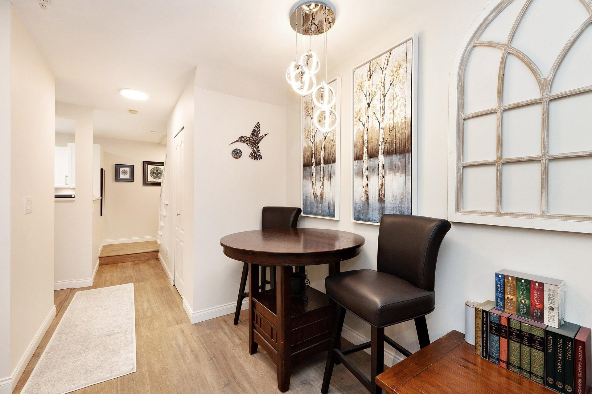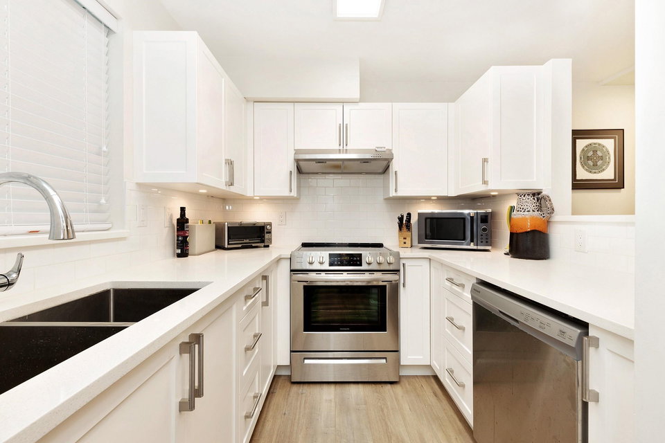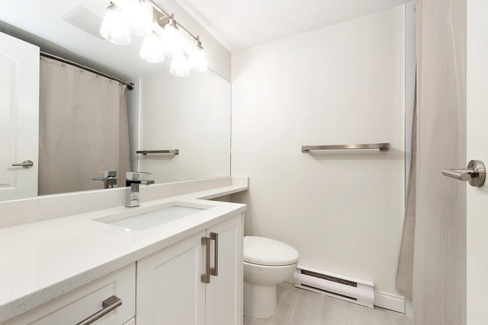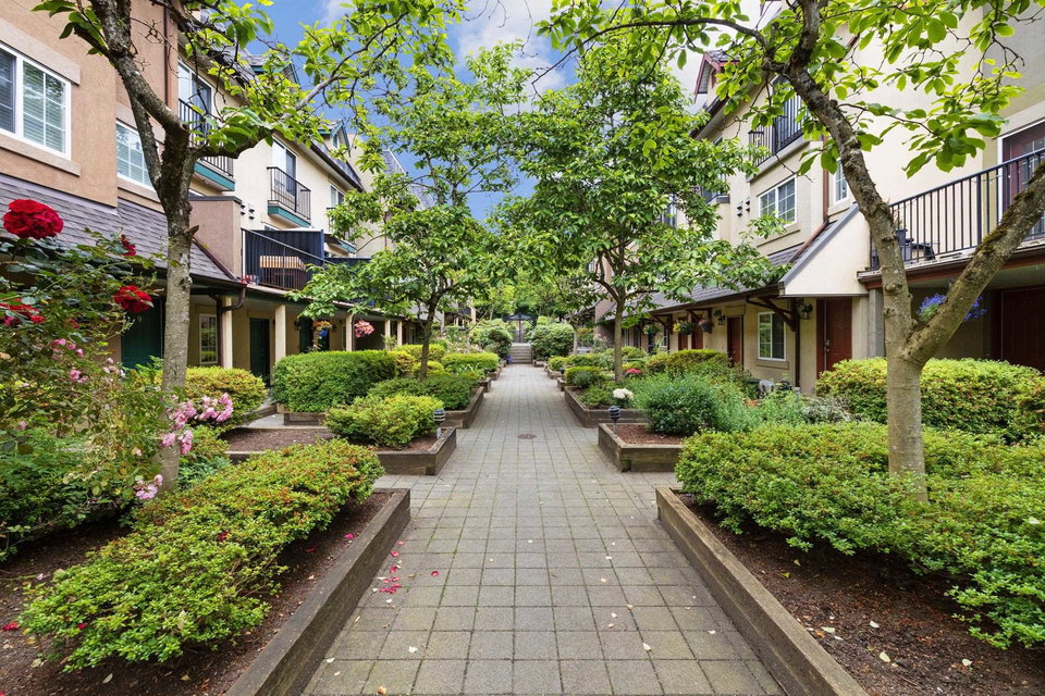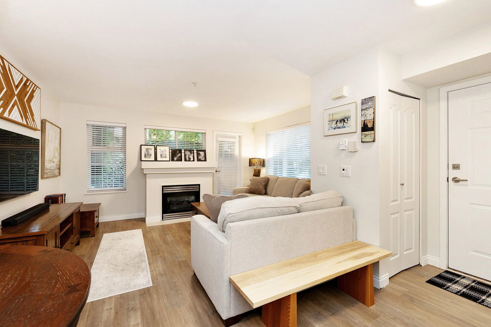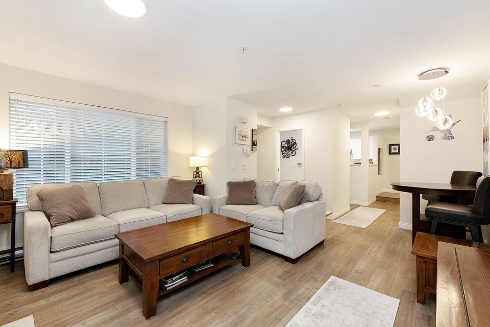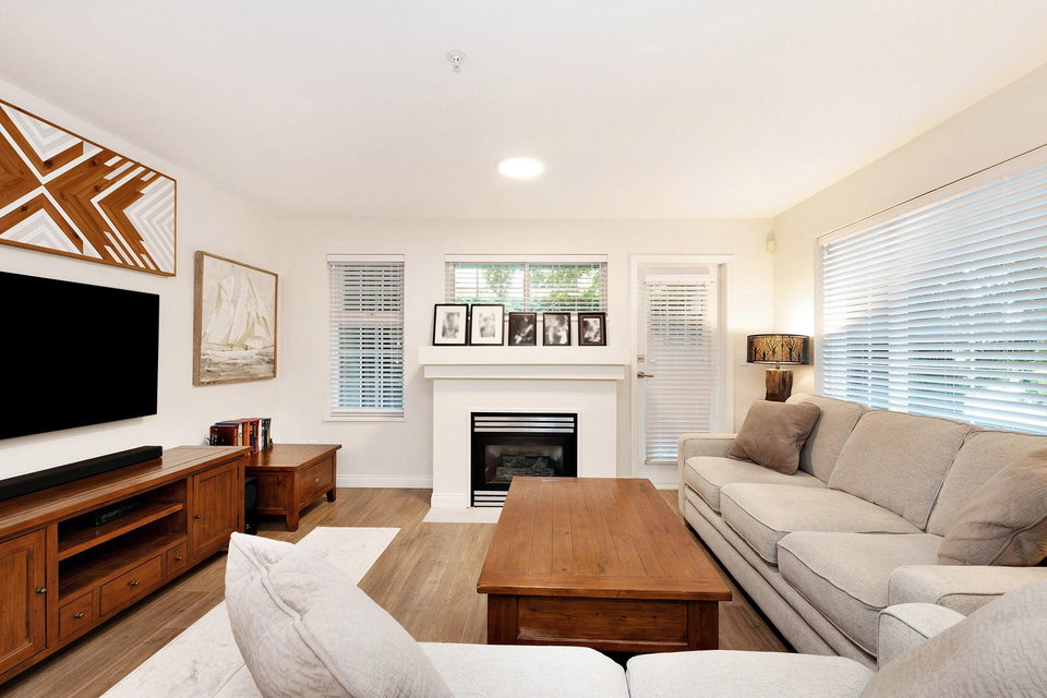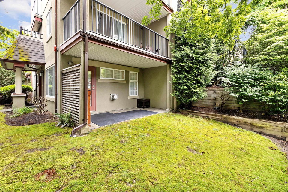 Rarely available! Private garden entry end unit tucked away from the main row of homes. Fully renovated. One of the larger floor plans in the complex. Features a large patio and yard area off the main living area (great for dogs), plus a large sundeck off the Primary bedroom upstairs. Kitchen with new cabinets, quartz counters, undermount sink and stainless steel appliances. 2 fully renovated baths with new upscale vanity, sinks, faucets, quartz counters, toilets & tile flooring. Modern laminate flooring on main. Gas fireplace. Insuite laundry. Shows like new! Secure parking, storage & bike room. Great location near Burnaby border, Lougheed Mall, Skytrain. Transit at your door and easy access to highway 1. Walk to schools, shopping, parks, movie theatres, restaurants & more. Pet friendly.