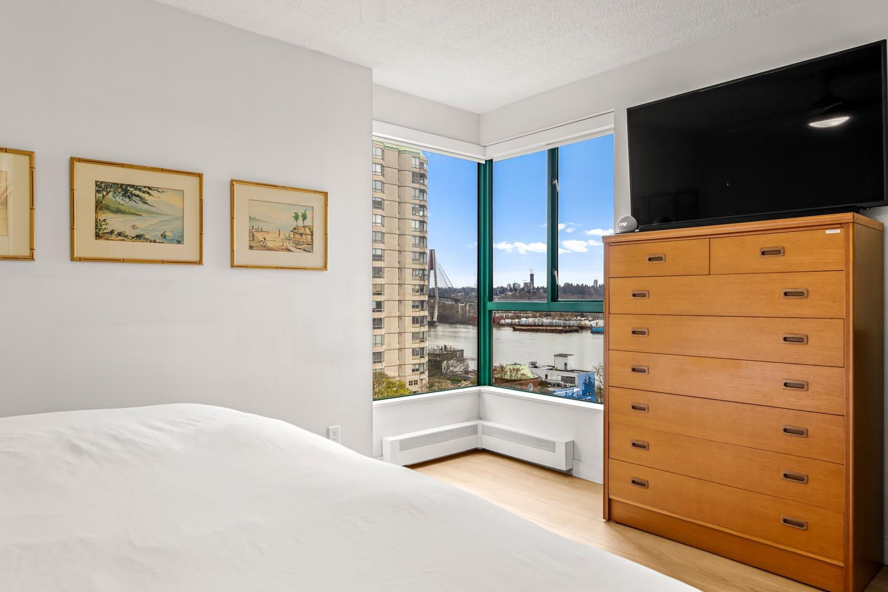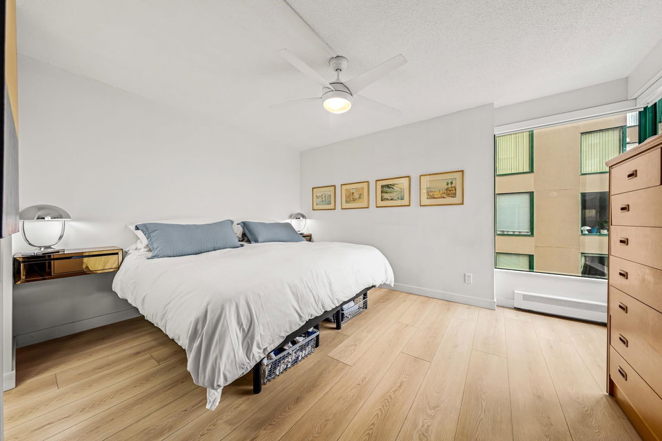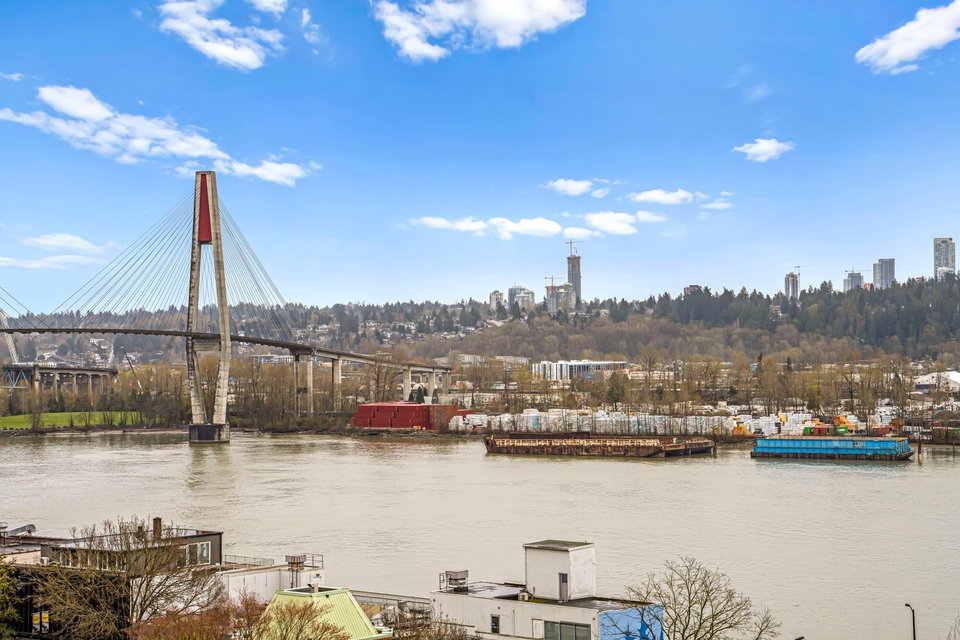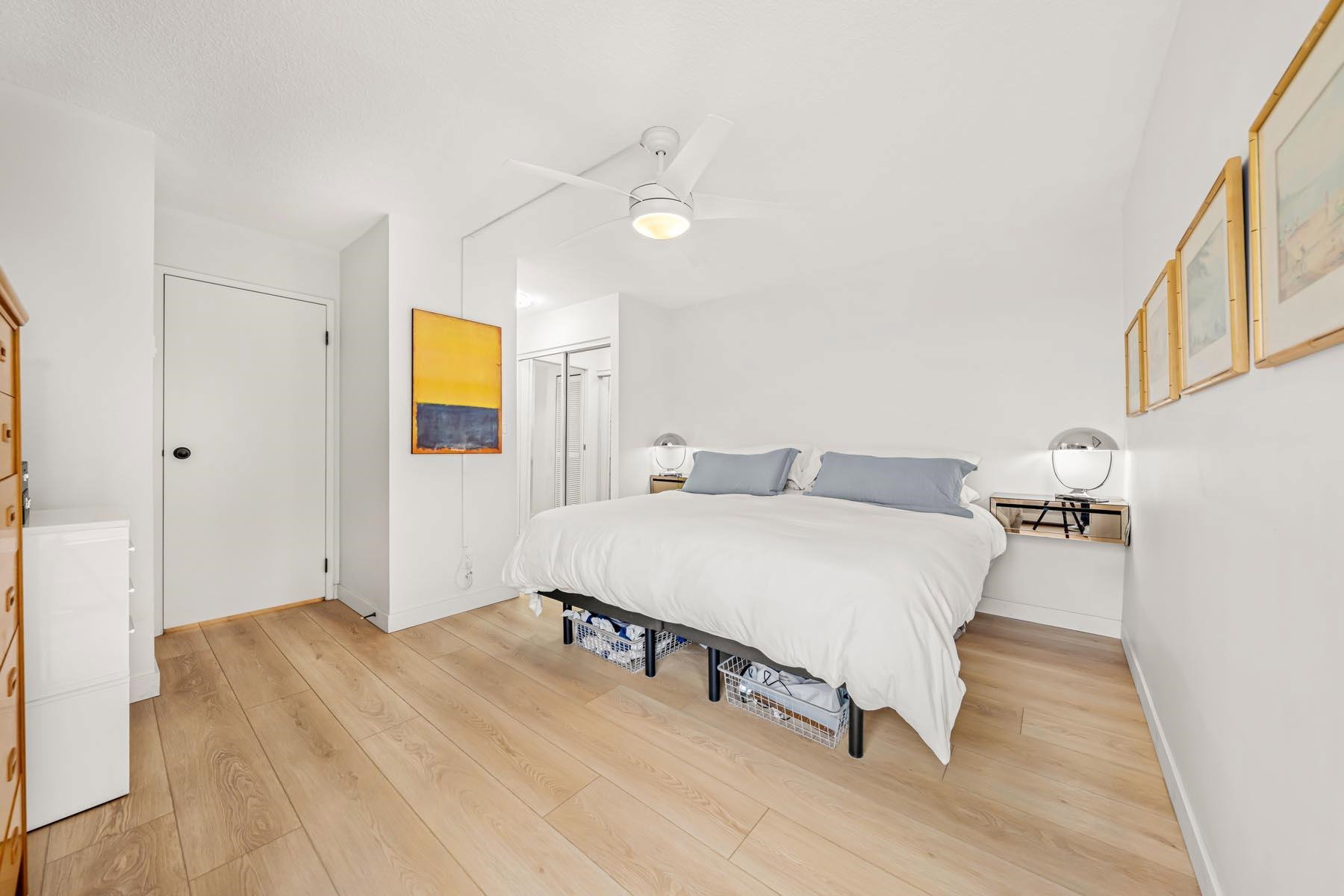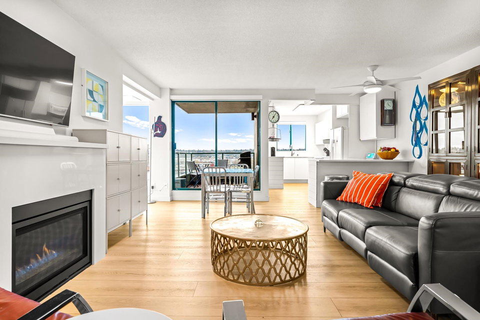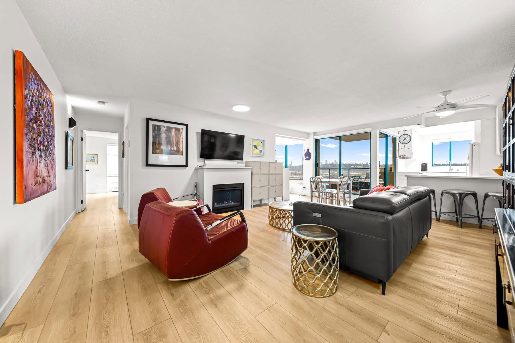 Stunning views from every room in this fully renovated corner unit. Nearly 1200 sq ft of interior space, huge rooms, great layout. Covered balcony (yes to BBQs) off the open kitchen featuring quartz counters/backsplash & touchless faucet. Other updates include 8″ vinyl plank floors, gas fireplace & quartz mantle, motorized blinds on all windows, beverage fridge, hot water tank (2022), LED lights, ceiling fans. Recent building upgrades: elevators, intercom system, fire panel. 2 dogs/cats allowed (any breed/size) and 1 parking stall (near elevator). Excellent amenities: on site caretaker, gym, pool, hot tub, sauna, common patio & courtyard. 98 walk score – coffee shops, restaurants, pubs & Pier Park are nearby. Columbia St skytrain is steps away with direct access through the parkade.