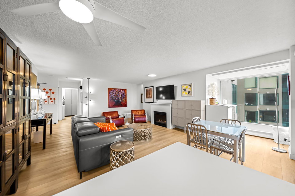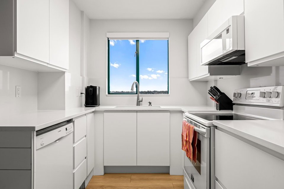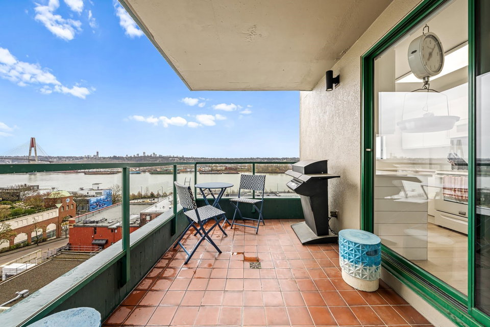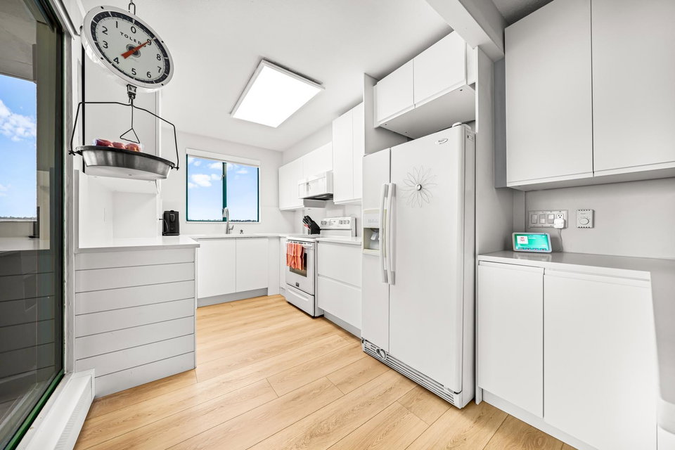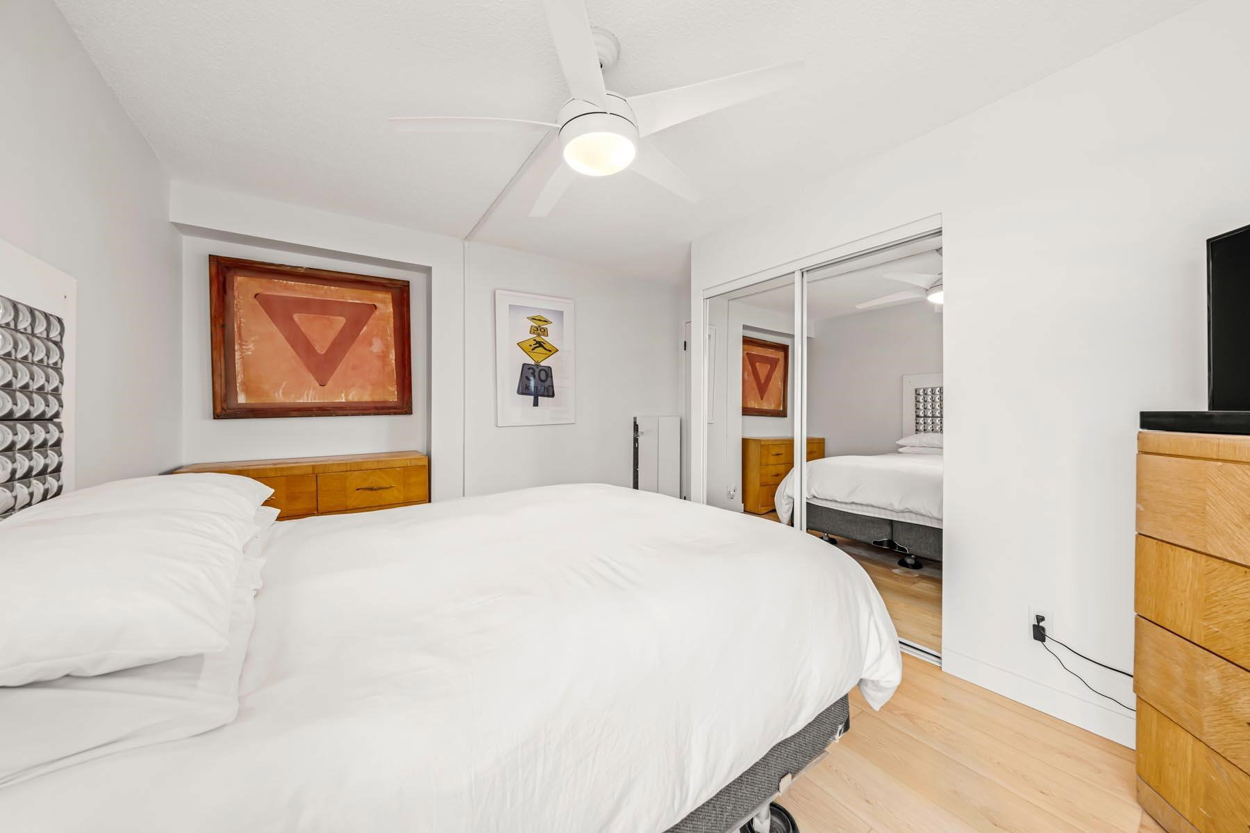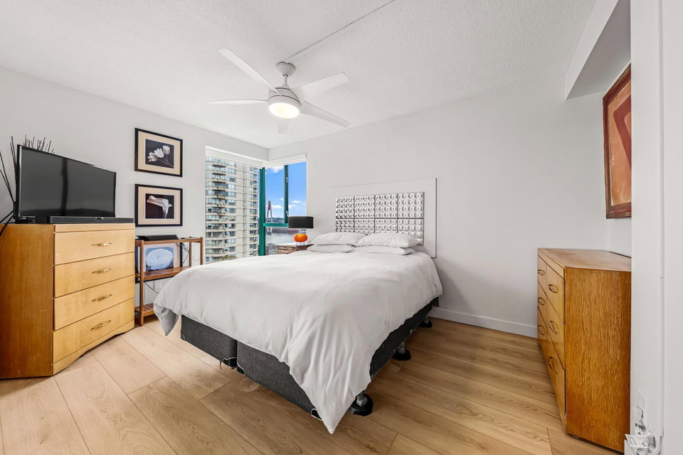 Stunning views from every room in this fully renovated corner unit. Nearly 1200 sq ft of interior space, huge rooms, great layout. Covered balcony (yes to BBQs) off the open kitchen featuring quartz counters/backsplash & touchless faucet. Other updates include 8″ vinyl plank floors, gas fireplace & quartz mantle, motorized blinds on all windows, beverage fridge, hot water tank (2022), LED lights, ceiling fans. Recent building upgrades: elevators, intercom system, fire panel. 2 dogs/cats allowed (any breed/size) and 1 parking stall (near elevator). Excellent amenities: on site caretaker, gym, pool, hot tub, sauna, common patio & courtyard. 98 walk score – coffee shops, restaurants, pubs & Pier Park are nearby. Columbia St skytrain is steps away with direct access through the parkade.