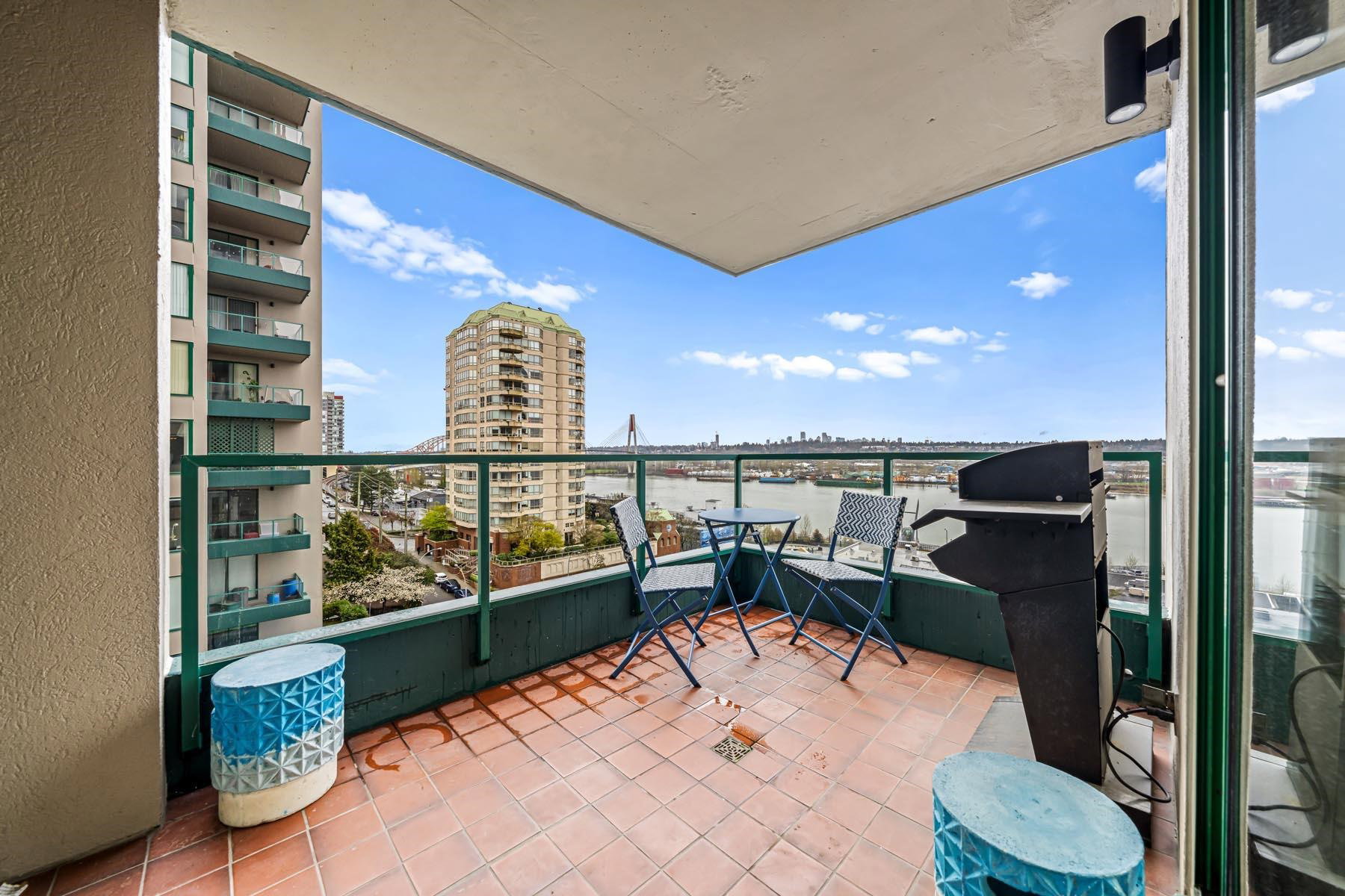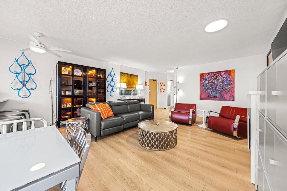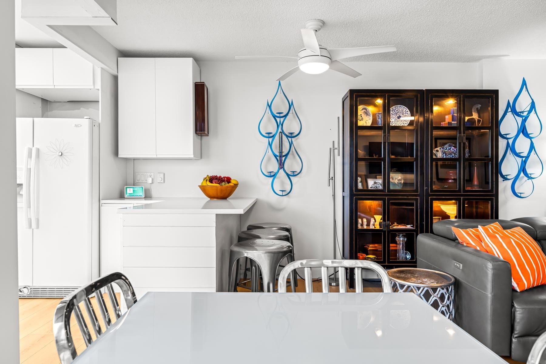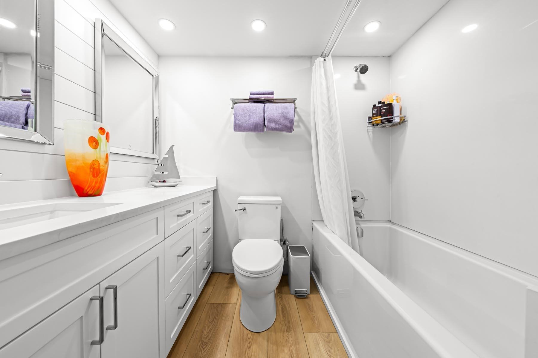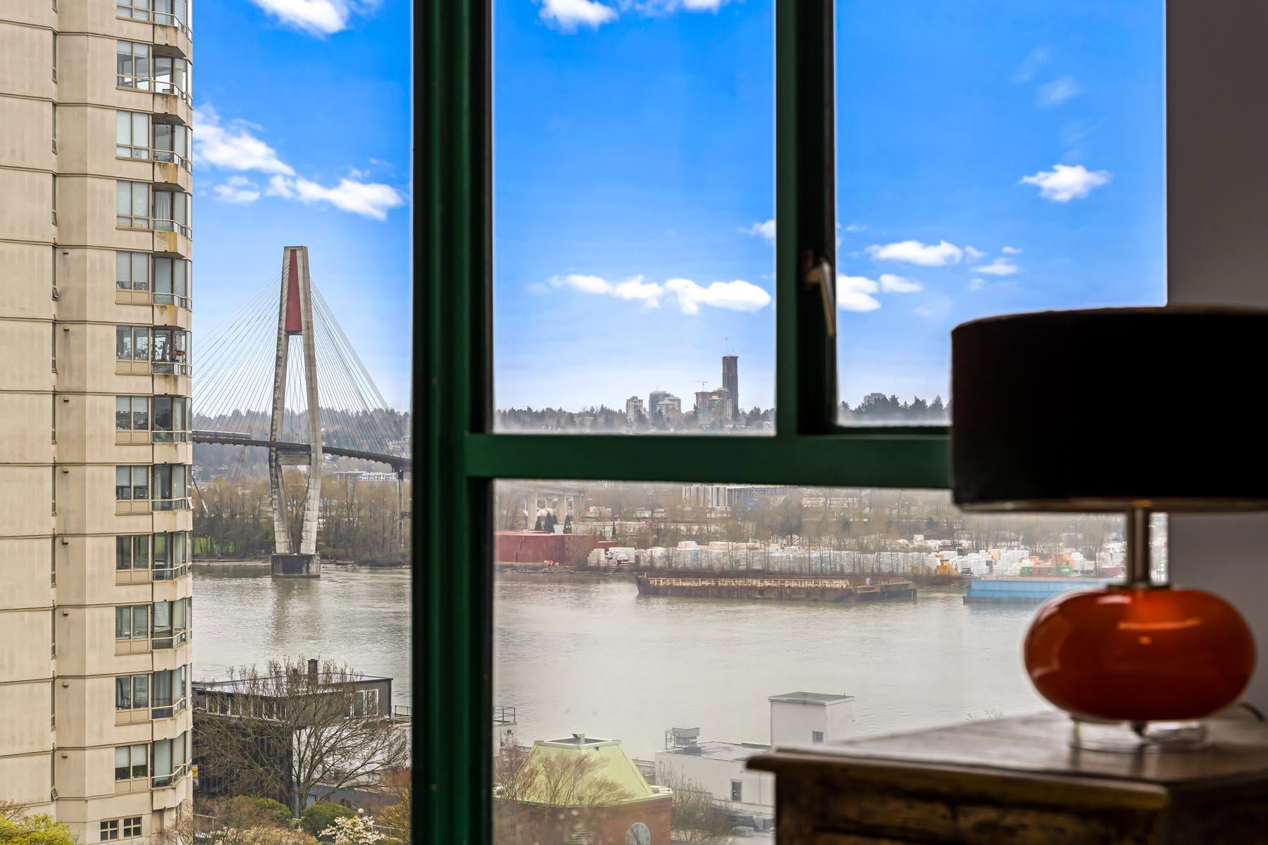 Stunning views from every room in this fully renovated corner unit. Nearly 1200 sq ft of interior space, huge rooms, great layout. Covered balcony (yes to BBQs) off the open kitchen featuring quartz counters/backsplash & touchless faucet. Other updates include 8″ vinyl plank floors, gas fireplace & quartz mantle, motorized blinds on all windows, beverage fridge, hot water tank (2022), LED lights, ceiling fans. Recent building upgrades: elevators, intercom system, fire panel. 2 dogs/cats allowed (any breed/size) and 1 parking stall (near elevator). Excellent amenities: on site caretaker, gym, pool, hot tub, sauna, common patio & courtyard. 98 walk score – coffee shops, restaurants, pubs & Pier Park are nearby. Columbia St skytrain is steps away with direct access through the parkade.