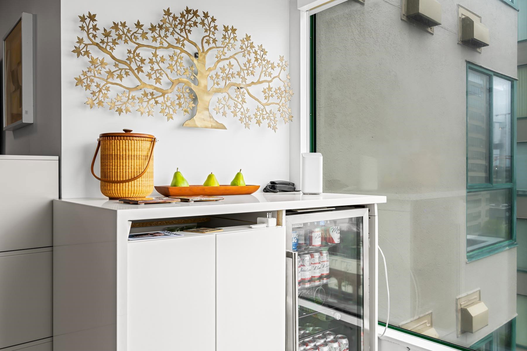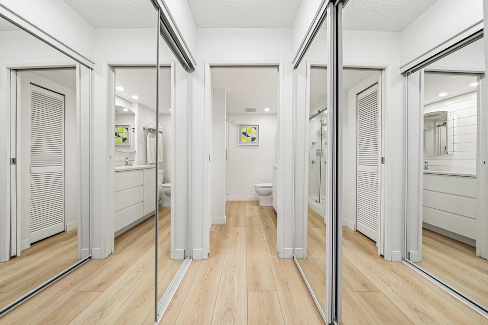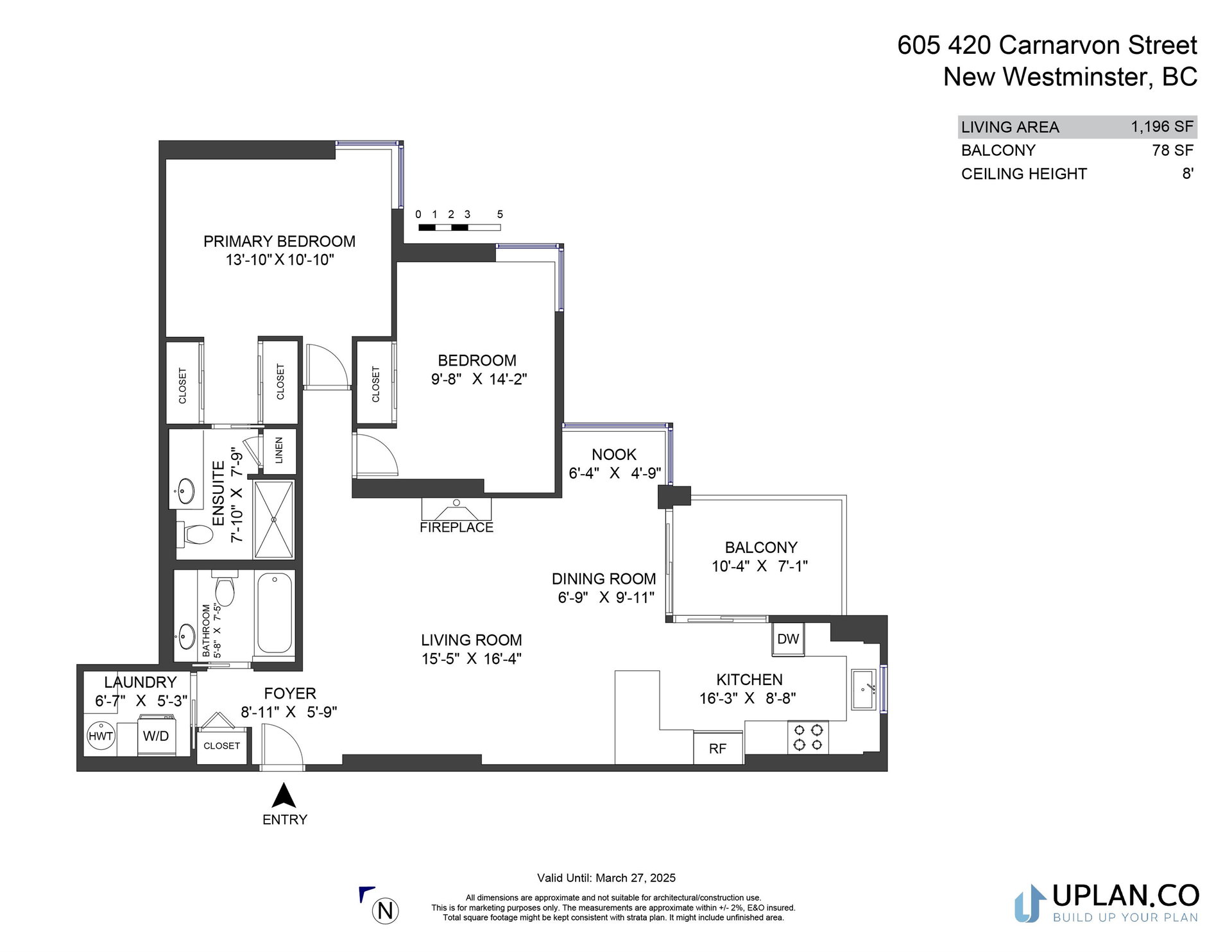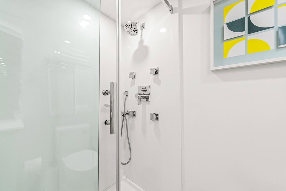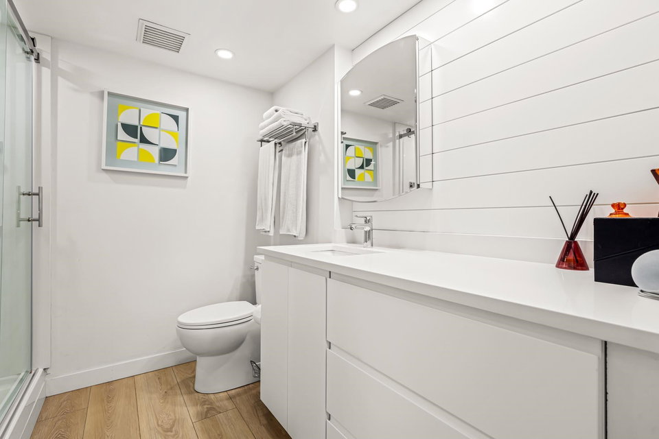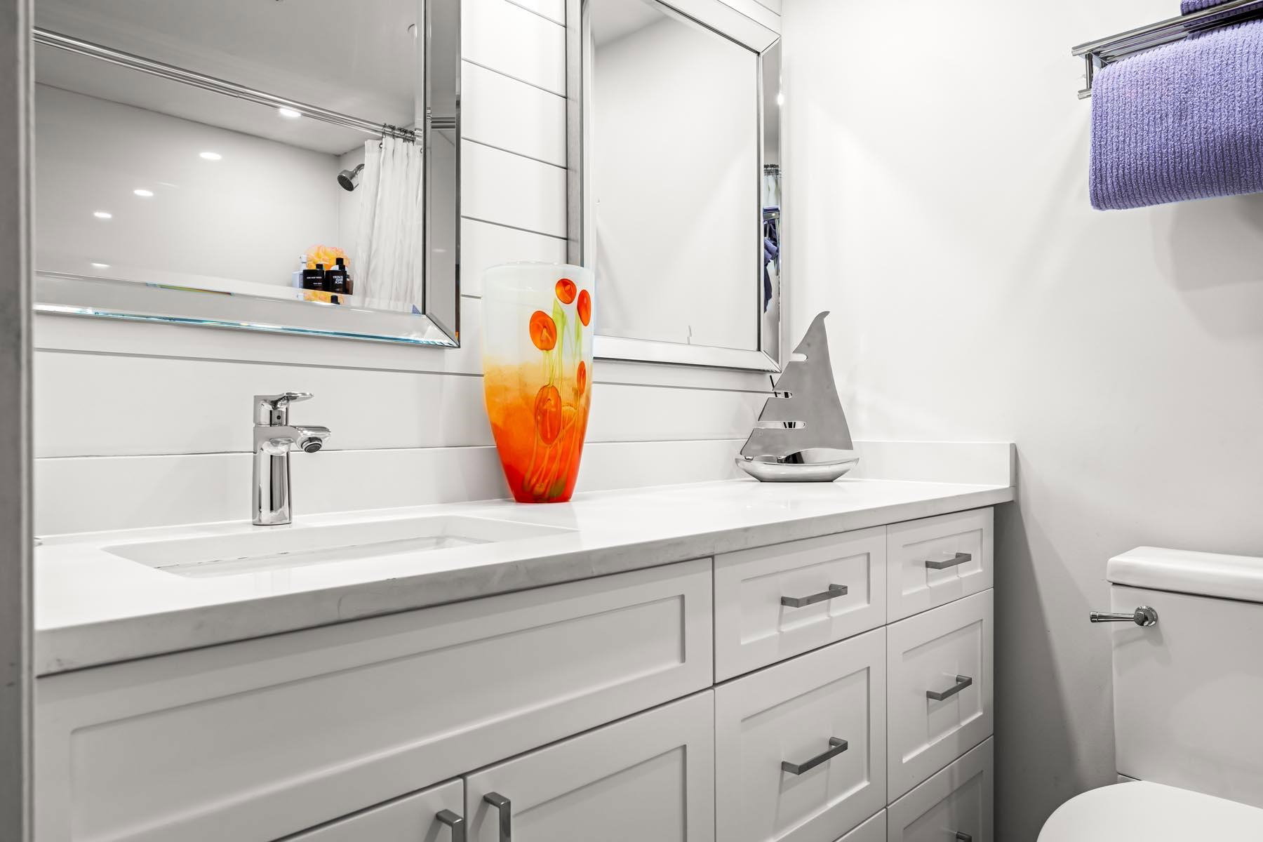 Stunning views from every room in this fully renovated corner unit. Nearly 1200 sq ft of interior space, huge rooms, great layout. Covered balcony (yes to BBQs) off the open kitchen featuring quartz counters/backsplash & touchless faucet. Other updates include 8″ vinyl plank floors, gas fireplace & quartz mantle, motorized blinds on all windows, beverage fridge, hot water tank (2022), LED lights, ceiling fans. Recent building upgrades: elevators, intercom system, fire panel. 2 dogs/cats allowed (any breed/size) and 1 parking stall (near elevator). Excellent amenities: on site caretaker, gym, pool, hot tub, sauna, common patio & courtyard. 98 walk score – coffee shops, restaurants, pubs & Pier Park are nearby. Columbia St skytrain is steps away with direct access through the parkade.