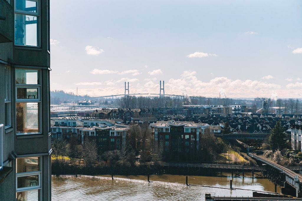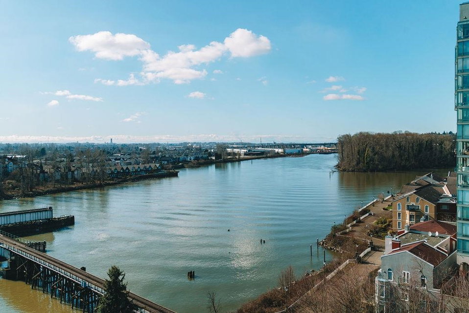 Waterfront living with sweeping river and city views from north to south. This spacious 2 bedroom + extra large den corner suite offers a large living room and a dining area perfect for hosting. The large den/office could easily be a 3rd bedroom or opened up for additional family space! Both bathrooms have been freshly renovated, and the home features stainless steel appliances, granite countertops, in-suite laundry, and a covered balcony with stunning river views you can enjoy year-round. Very well-maintained building, rain-screened with updated roof, piping, boiler, and elevators. Amenities include an indoor pool, hot tub, sauna, and gym. Walk straight out to the riverfront boardwalk & park, and enjoy being steps to SkyTrain & shops. Open House Sunday March 15th 12p-2p