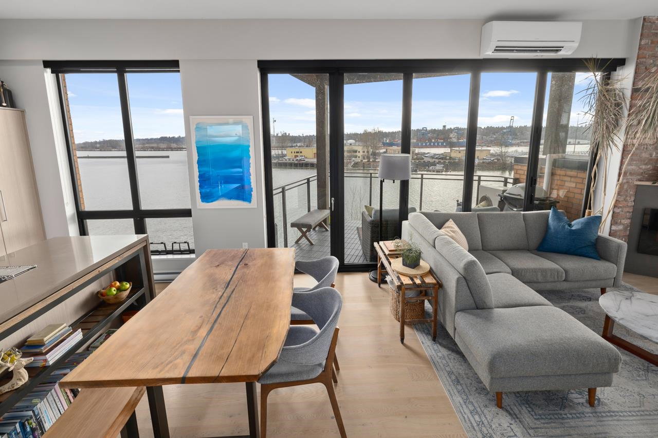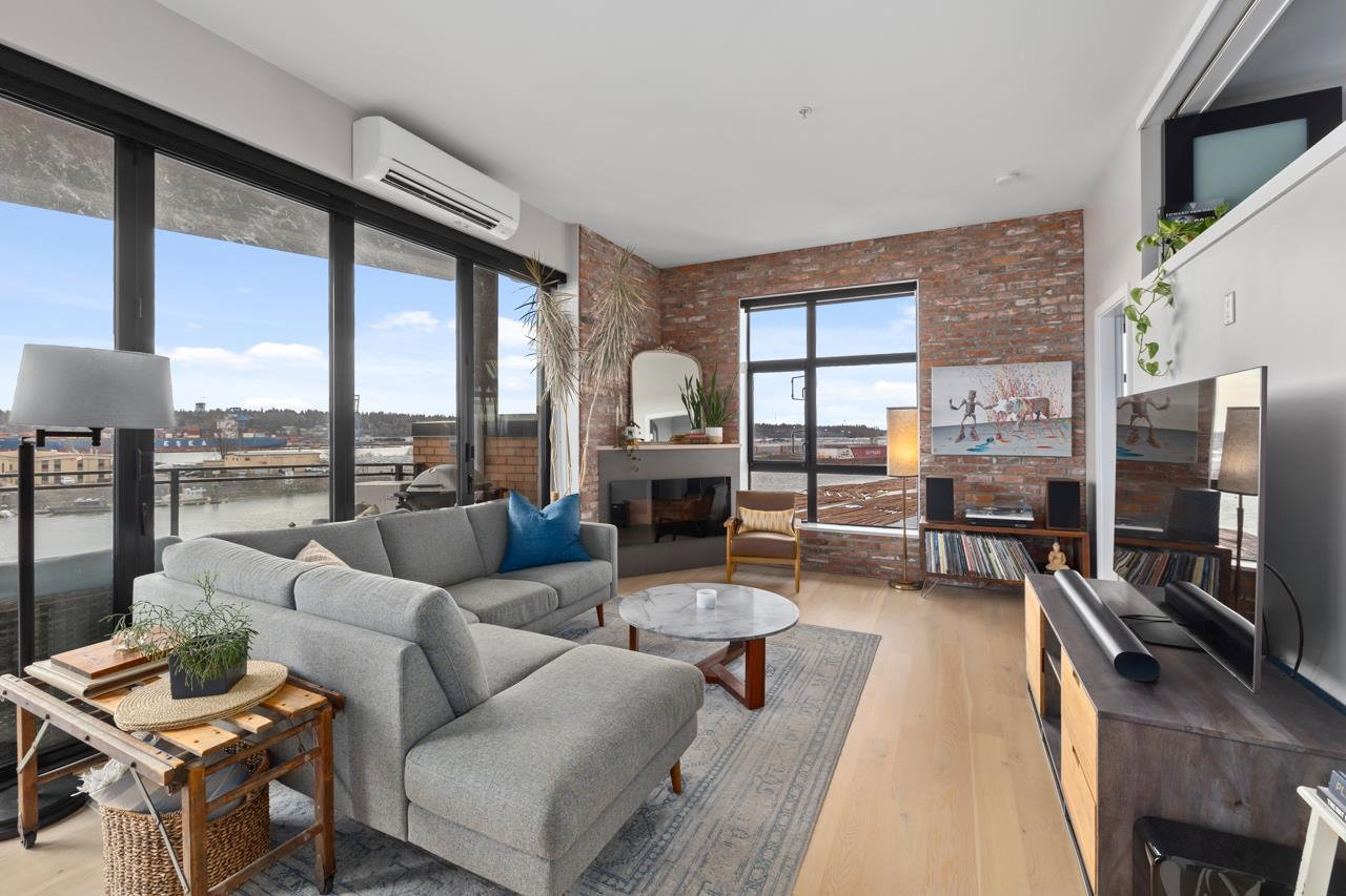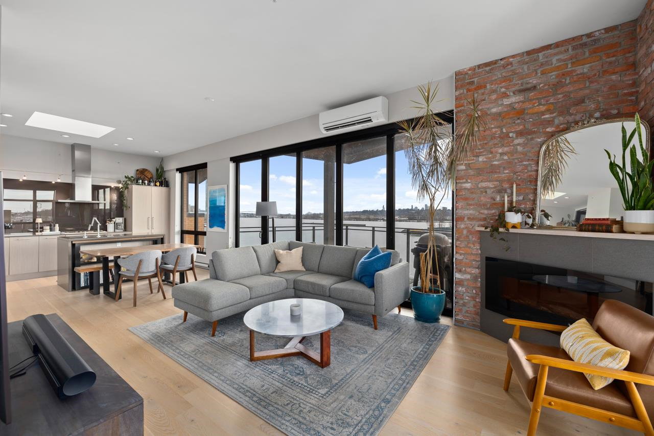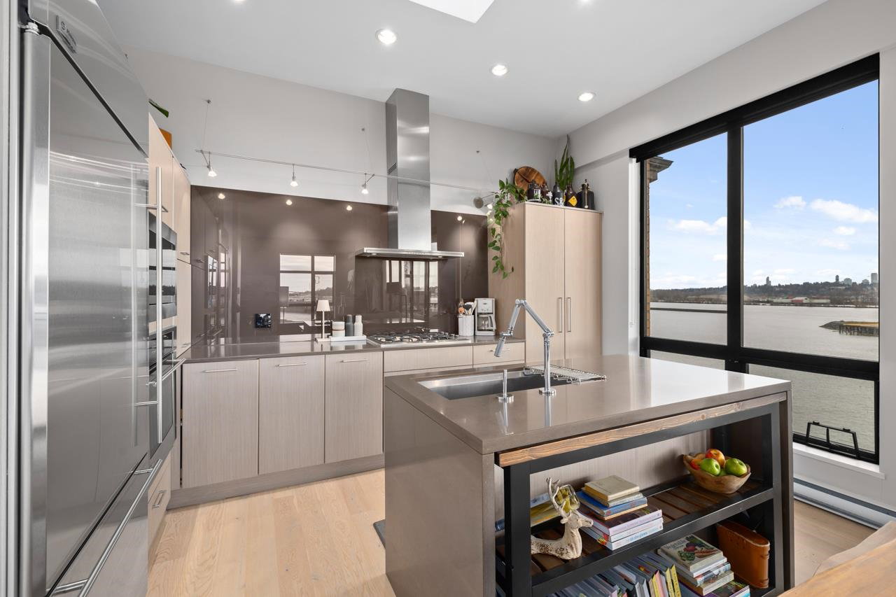 THIS is the one you’ve been waiting for! Experience elevated riverfront living w/ unobstructed water views in this top-floor, corner 3-bed home in sought-after Glasshouse Lofts, in Port Royal community. Lofty 10’ ceilings, skylight over kitchen, reclaimed brick, & expansive windows showcase water views from every room & mountain views from the front. The kitchen boasts quartz counters, Kohler fixtures, custom built-ins & GE Monogram SS appliances, opening to a bright living space w/ accordion doors extending to a generous covered balcony w/ water views. Custom closet built-ins & 2nd bedrm features expansive built-in office workspace & cabinets. TWO secure, underground EV-ready parking & storage locker. Steps to Port Royal Park & Q2Q Ferry taking you to River Market & SkyTrain.