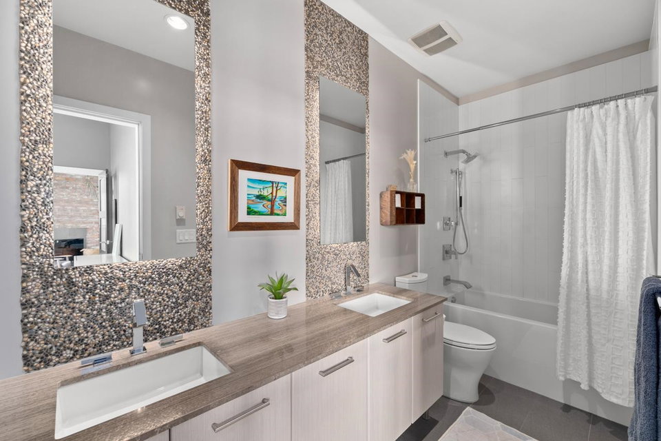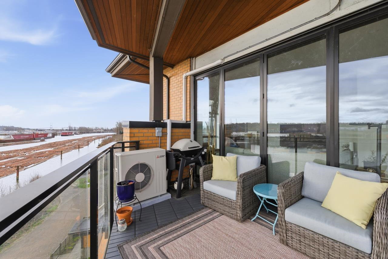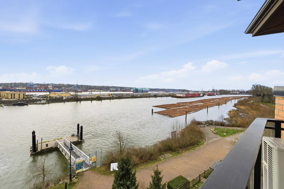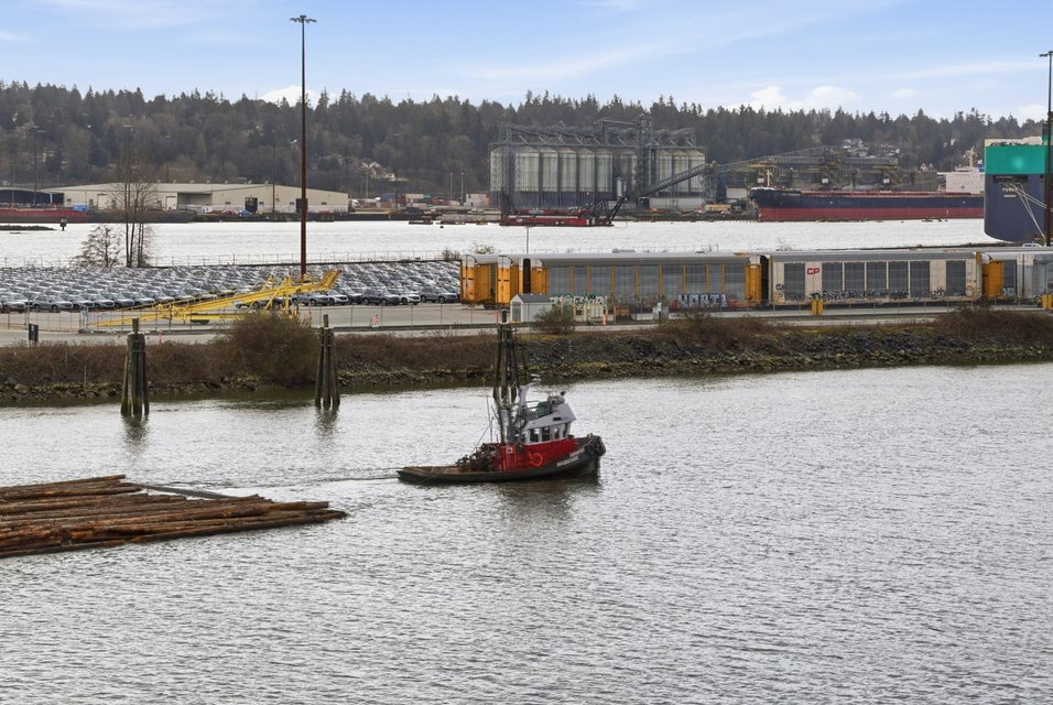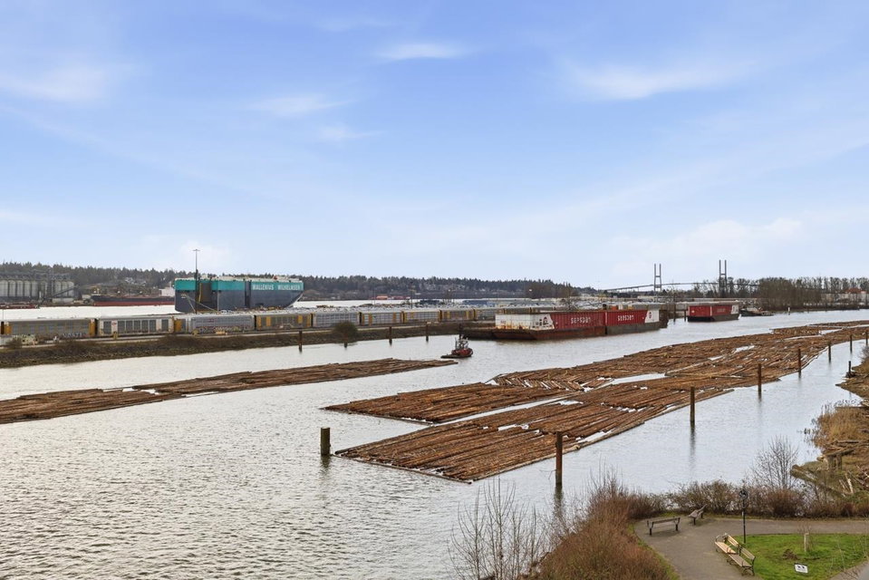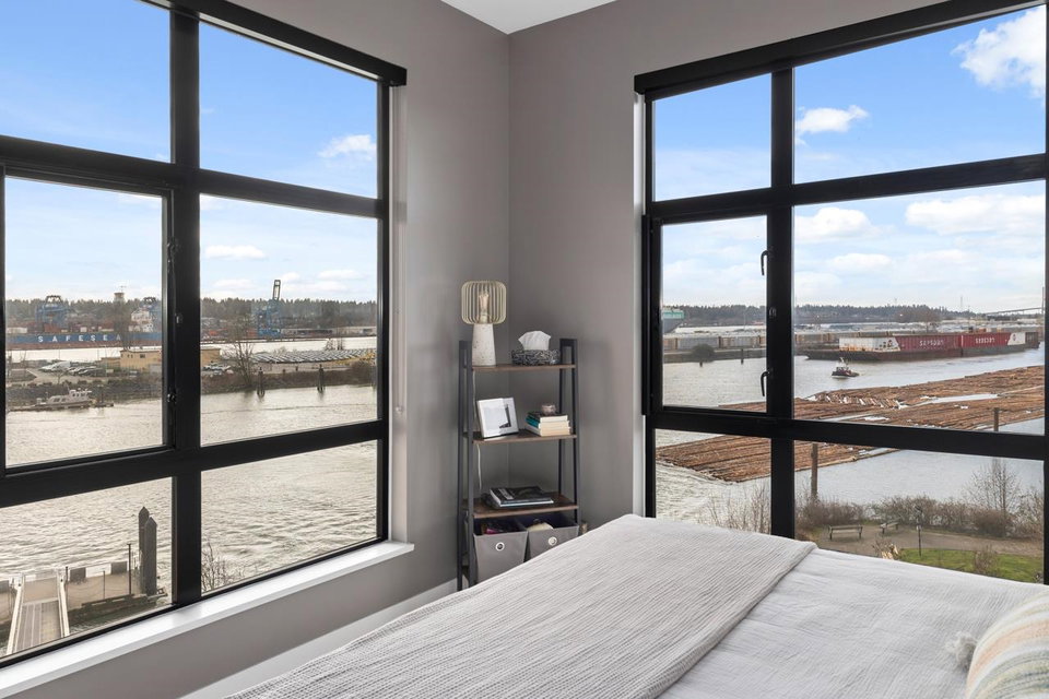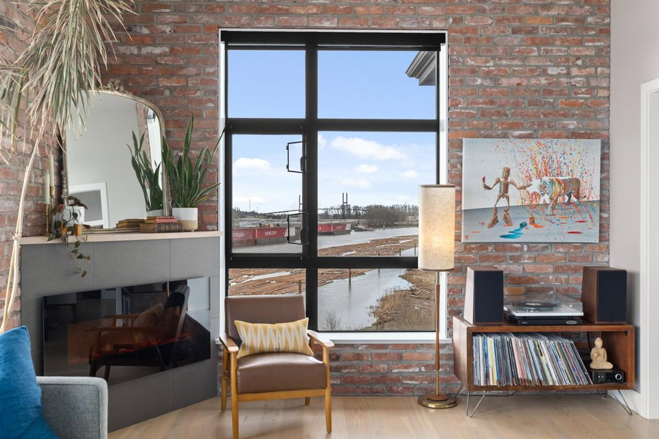 THIS is the one you’ve been waiting for! Experience elevated riverfront living w/ unobstructed water views in this top-floor, corner 3-bed home in sought-after Glasshouse Lofts, in Port Royal community. Lofty 10’ ceilings, skylight over kitchen, reclaimed brick, & expansive windows showcase water views from every room & mountain views from the front. The kitchen boasts quartz counters, Kohler fixtures, custom built-ins & GE Monogram SS appliances, opening to a bright living space w/ accordion doors extending to a generous covered balcony w/ water views. Custom closet built-ins & 2nd bedrm features expansive built-in office workspace & cabinets. TWO secure, underground EV-ready parking & storage locker. Steps to Port Royal Park & Q2Q Ferry taking you to River Market & SkyTrain.
